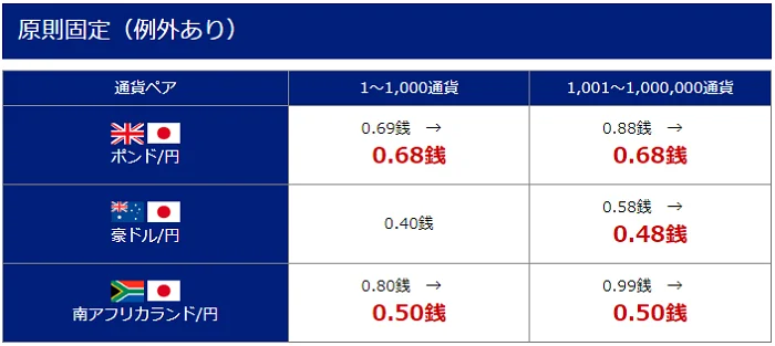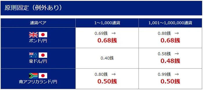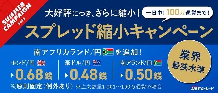 キャンペーン期間中のFX取引サービス(SBI FXTRADE)において、以下の通りポンド/円、豪ドル/円、南アフリカランド/円の3通貨ペアのスプレッドを縮小いたします。