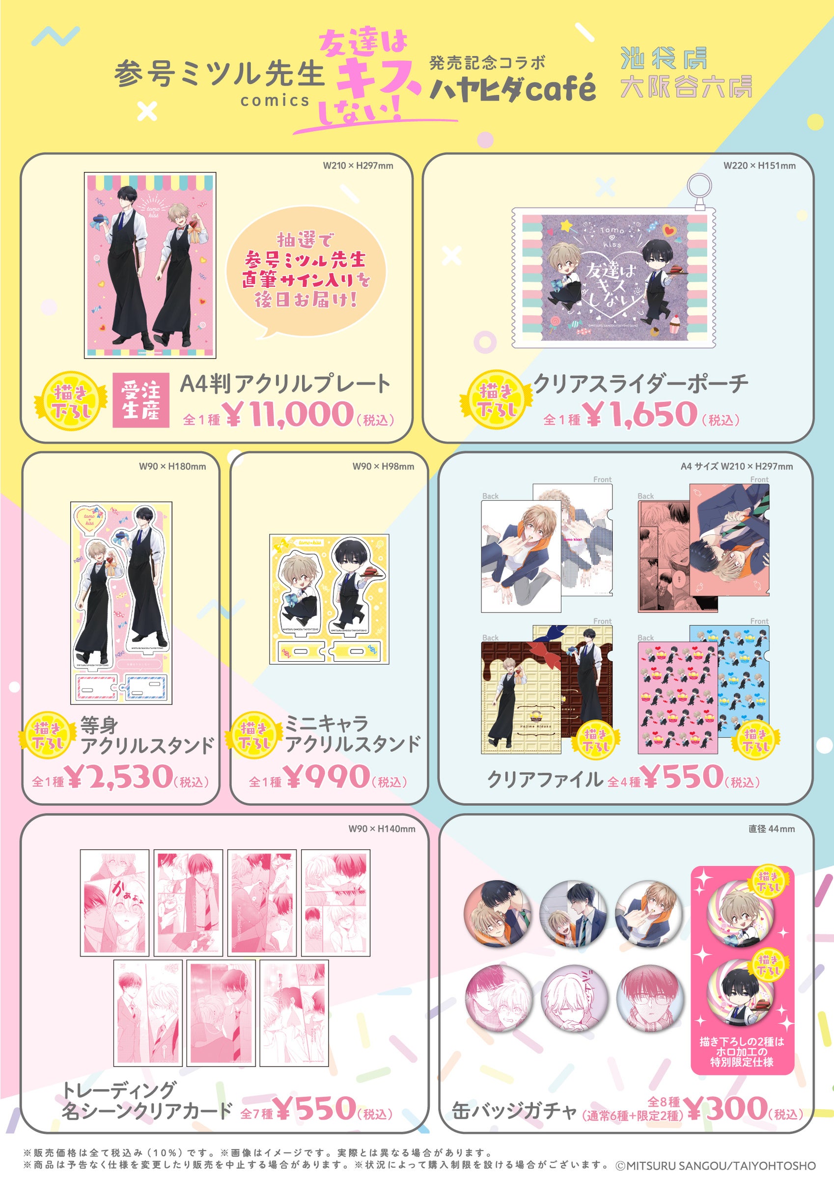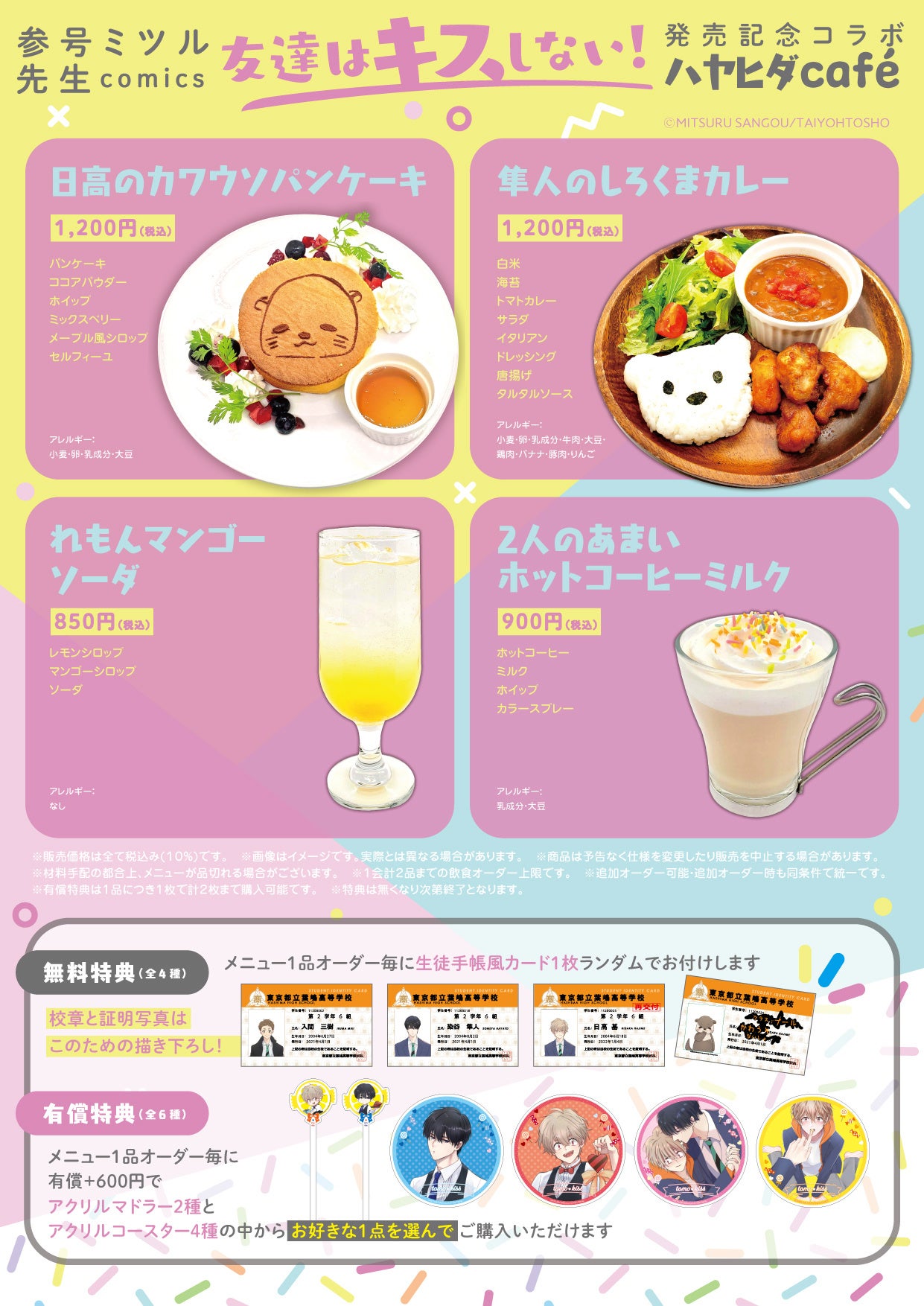 参号ミツル先生 comics「友達はキスしない!」発売記念コラボ ハヤヒダcaféが1月21日より池袋虜で、2月18日より大阪谷六虜にて開催!