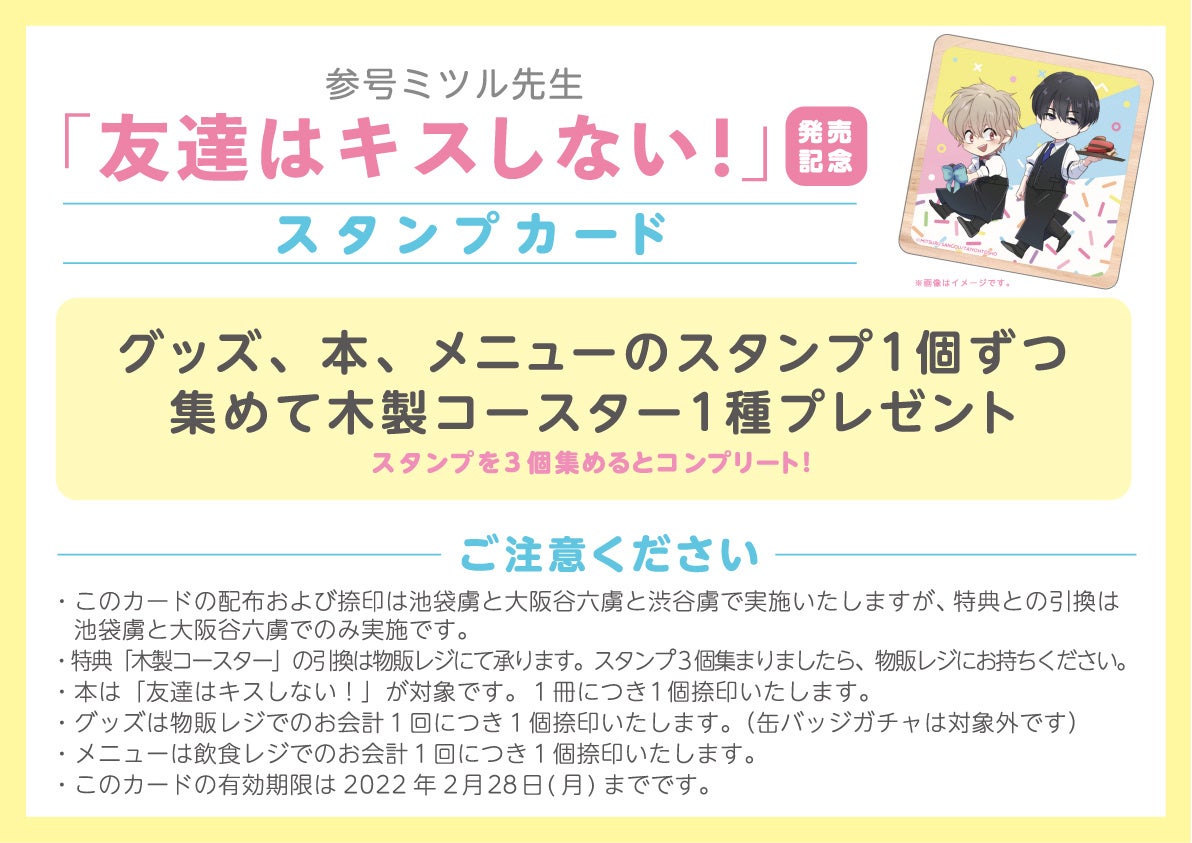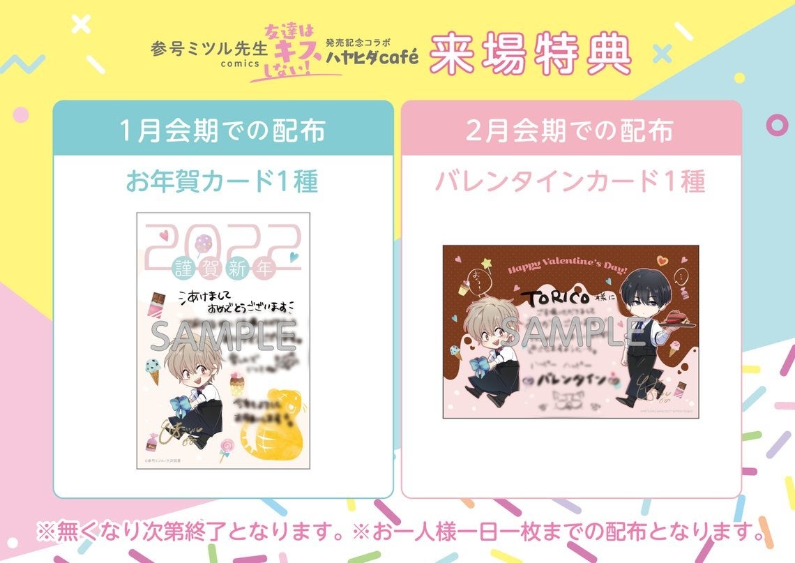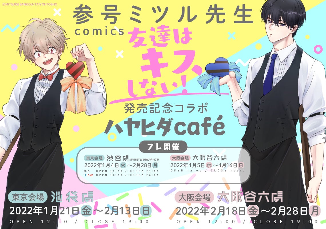 株式会社TORICO(本社:東京都千代田区 代表:安藤拓郎)は、2022年1月21日(金)~2月13日(日)まで東京都豊島区西池袋「池袋虜」にて、2022年2月18日(金)~2月28日(月)まで大阪府中央区谷町6丁目の「大阪谷六虜」にて、参号ミツル先生 comics「友達はキスしない!」発売記念コラボ ハヤヒダcaféを開催いたします。