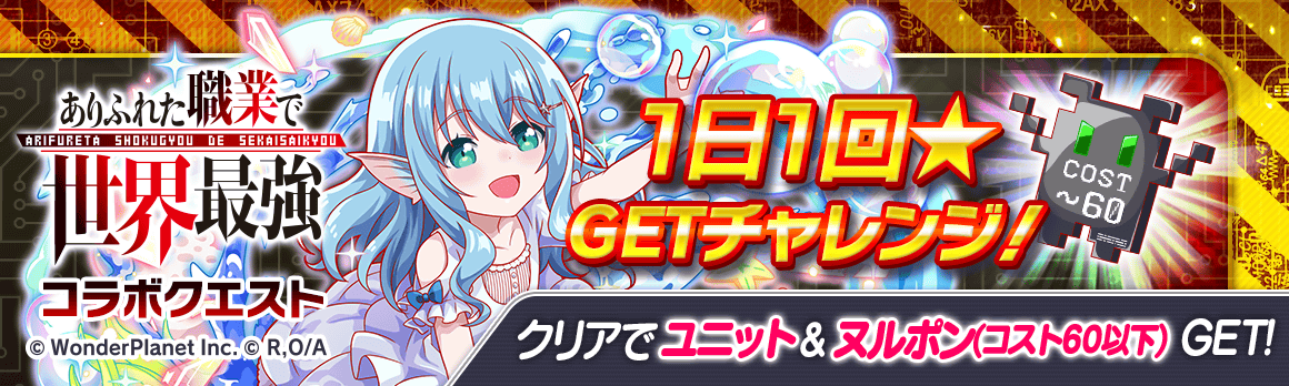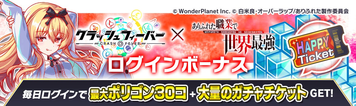 エンターテインメントサービス事業を行うワンダープラネット株式会社(本社:愛知県名古屋市、代表取締役社長CEO:常川友樹、東証マザーズ上場:証券コード4199、以下当社)は、iOS/Android端末向けに配信中のスマートフォンゲーム『クラッシュフィーバー』において『ありふれた職業で世界最強』とのコラボイベントの実施を決定したことをお知らせいたします。