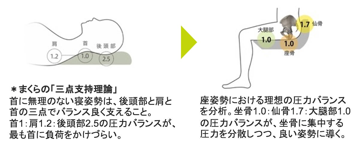 まくらの開発で培った圧力バランスの独自理論「三点支持理論*」を応用。寝具に使用する体圧測定器を使ってお尻の座圧バランスとポイントを把握し、坐骨、仙骨、大腿部における理想の圧力バランスを分析。坐骨、仙骨、大腿部の三点でバランス良く支えることで、坐骨部分にかかる圧力を分散します。