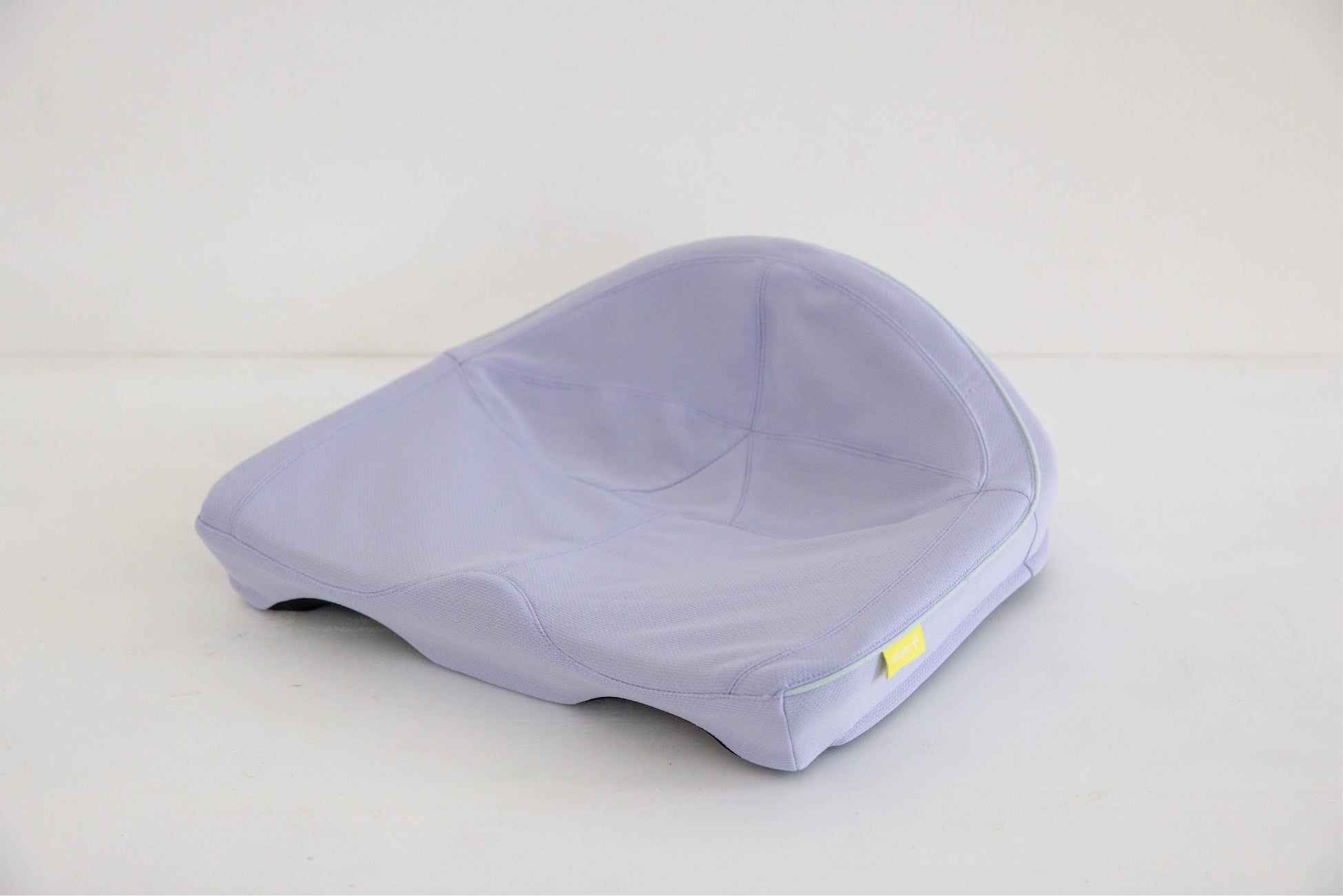 子どもの姿勢の悪さを気にされている親御様が多いことを受け、“お尻のまくら”の子ども用『Keeps クッション for kids』の商品化が実現。大人用と同様に、まくらの開発で培った圧力バランスの独自理論「三点支持理論」を応用した独自の立体構造で、骨ポジションを安定させ、崩れがちな子どもの姿勢を背筋が伸びた理想的な座姿勢に導きます。坐骨・仙骨・大腿骨の3点で姿勢と圧力バランスを整え、仙骨と坐骨をやさしくホールドすることで、長時間でも自然に骨盤の立った理想の姿勢をキープします。5才から12才くらいまで約8年間ほど使用いただけるサイズ感です。クッションは大人用よりもやわらかく、裏生地に滑り止め加工を施した船底形状なので様々な椅子にご使用いただけます。