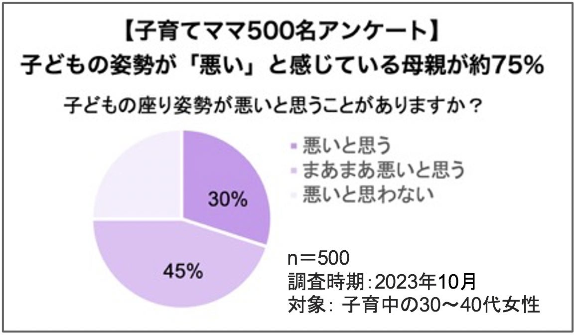 「Keeps 骨盤サポートクッション」のご愛用者様からは、「家庭学習やゲーム中の子どもの姿勢が気になるのでキッズサイズがほしい」という声を多くいただいておりました。また、当社が30〜40代の子育て中のママ500名にお子様の姿勢についてアンケートを実施したところ、 「姿勢が悪いと思う」が約30%、「まあまあ悪いと思う」が45%となり、75%の母親が子どもの姿勢が悪いと感じていました。姿勢の悪さを感じるシーンは、「食事中」が49.6%と約半数を占め、次いで「テレビ視聴やゲーム中」が44.8%、「勉強時」が38.0%となりました。
