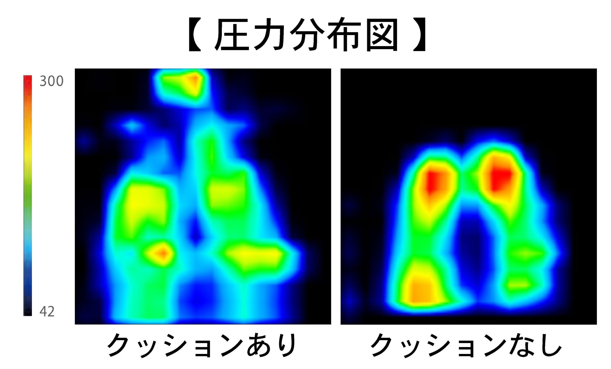 座り姿勢でお尻にかかる圧力を計測。クッションなしでは、坐骨部分が赤く反応し、圧力が集中している。クッションありでは、ほとんど赤く反応している箇所がなく、圧力が分散されていることがわかる。
