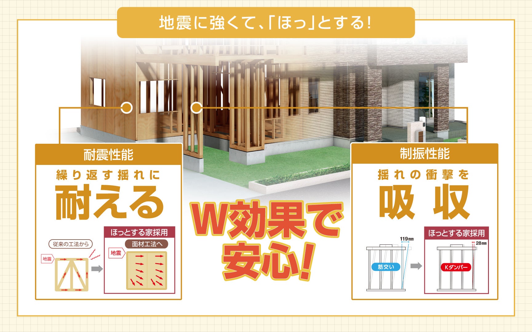 地震の揺れによる建物へ負担が少ない平屋に、耐震(地震に耐える)性能の高い面材工法、 制震(地震の衝撃を軽減する)性能の高いKダンパーを採用。W効果で長く安心して暮らすことができます。