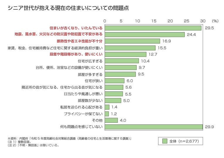 現在、日本は約4人に1人が65歳以上の高齢者という超高齢社会。将来の平均寿命は男性で85.89年、女性は91.94年と想定され、健康寿命も延伸し、年齢を重ねてもアクティブに日常生活を過ごしたい方が多くなっていくと考えます。一方で、シニア世代が抱える現在の住まいについての問題点の上位には、「地震・災害などの防災面や防犯面での不安」「断熱性や省エネ性能が不十分」「段差、階段があり使いにくい」などが挙げられています。