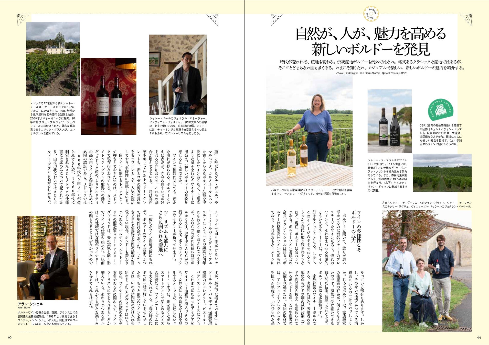 変わりゆくボルドーの新たな側面、魅力を、現地で取材をした生産者の取り組みを交え紹介するほか、シャンパーニュ有名メゾン各社のこの冬おすすめのアイテム、最新動向や、世界のワイン展示会、試飲会のイベントレポート、ワイン生産者の来日に伴うインタビュー記事など、ワイン&ワイン関連記事を多数掲載しています。