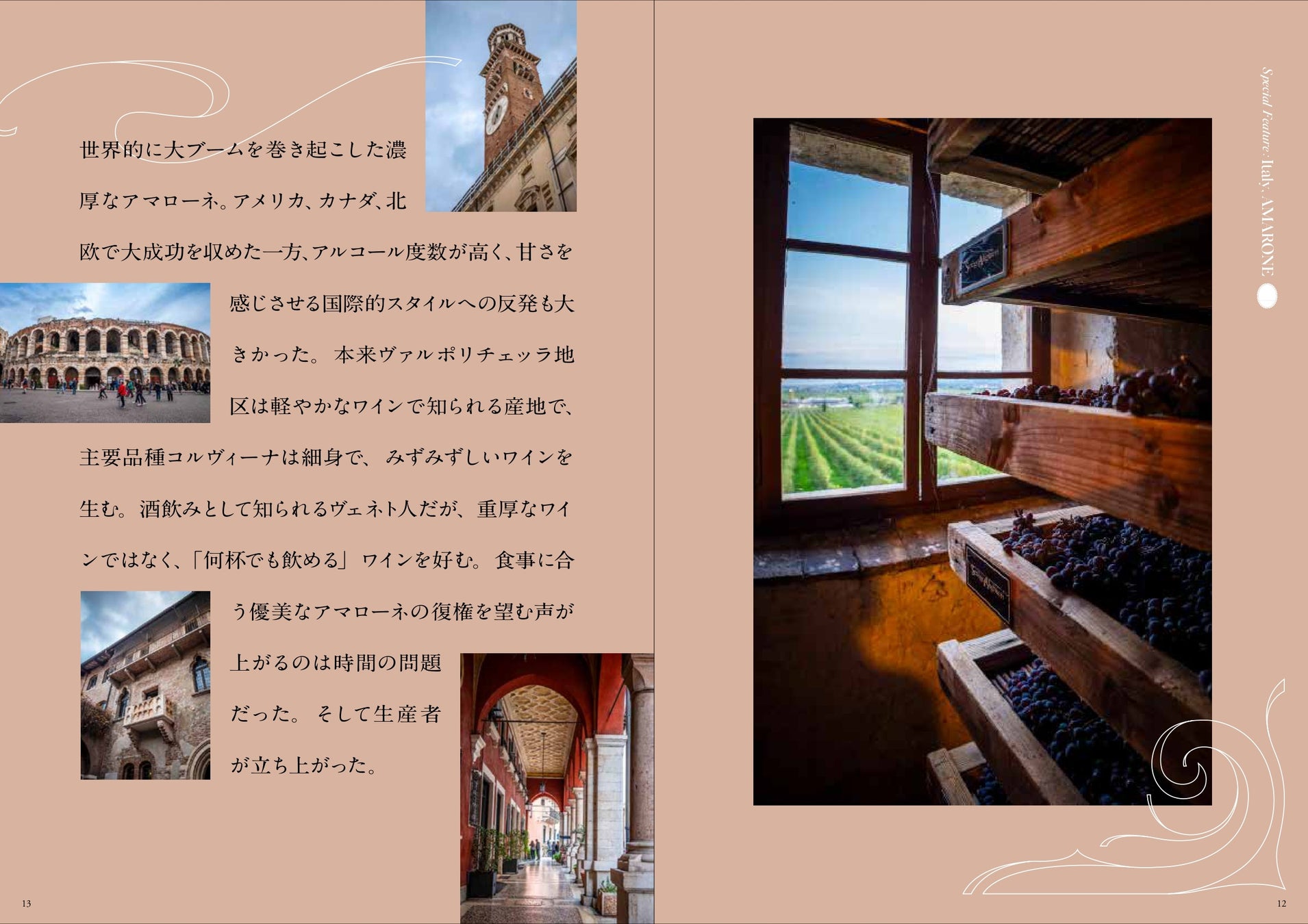 今回は、歴史ある家族経営のワイナリーで構成される「Famiglie Storiche」加盟の全13ワイナリーを現地にて取材。彼らのアマローネ造りに関して、そして造られるワインをくまなく紹介します。アルコールの高さからくる重厚さがありながら、透明感あるエレガントさも持ち合わせる、アマローネという唯一無二ののワインを知ることができる、貴重な特集です。