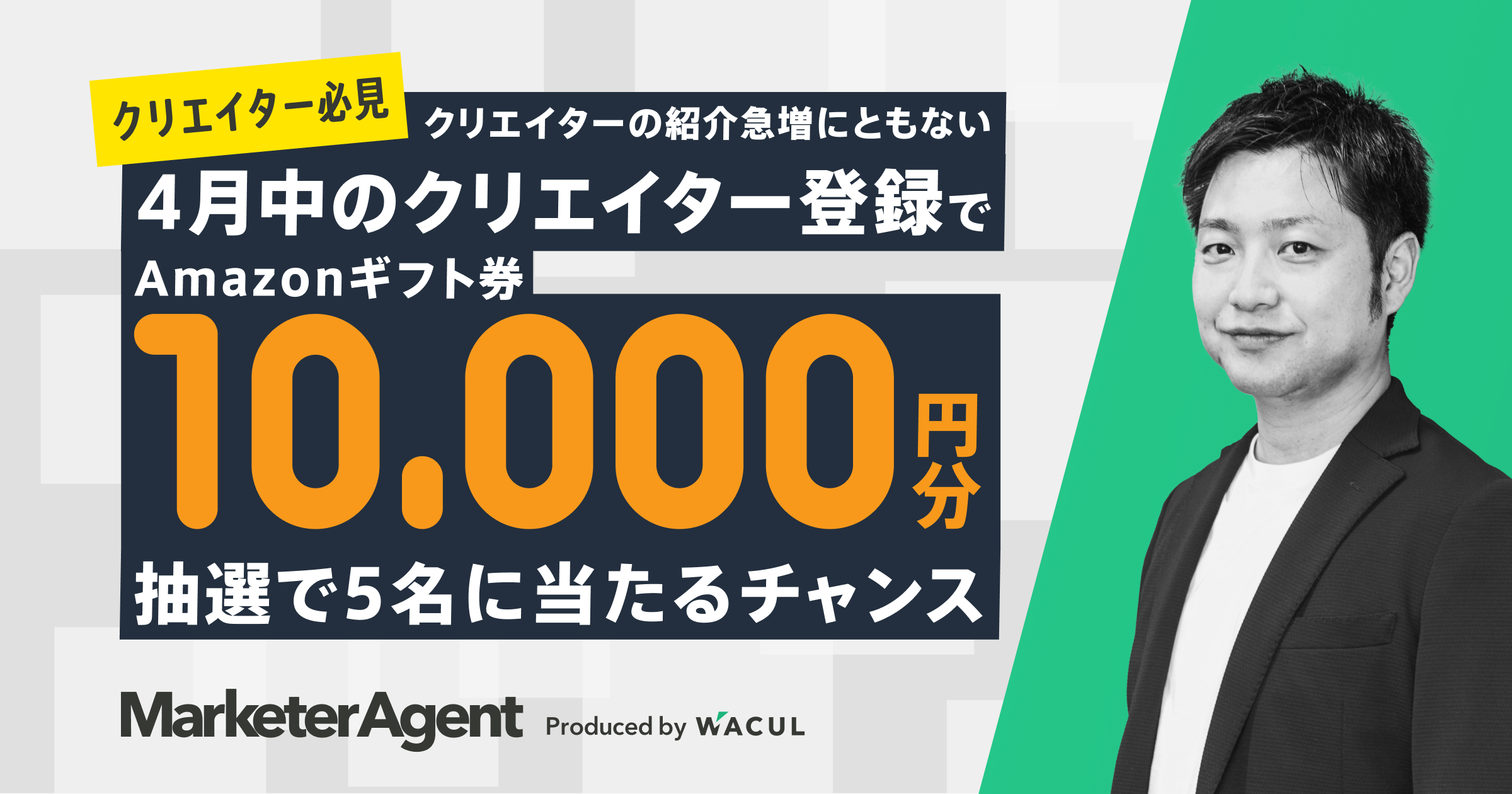当社が提供するマーケティング特化の案件紹介サービス「Marketer Agent」では、クリエイターの紹介を求めるクライアントが急増しているため、クリエイターの紹介強化を行っております。それに伴い2023年4月中に当社クリエイター募集サイト(https://wacul.co.jp/lp/marketer-agent-creator/)にてクリエイター登録をした方の中から抽選で5名にAmazonギフト券1万円分をプレゼントするキャンペーンを開始します。