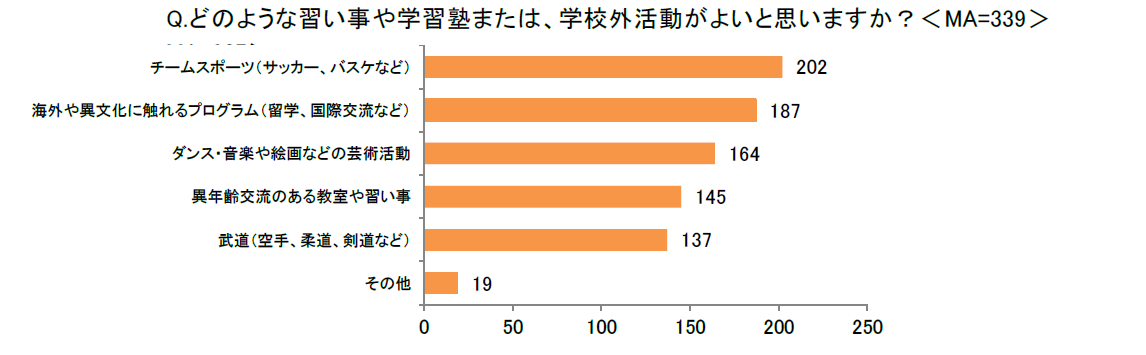 「どのような習い事・学習塾または、学校外活動がよいと思いますか?<MA>」と尋ねたところ、「チームスポーツ(サッカー、バスケなど)」(202)が最多となり、次いで「海外や異文化に触れるプログラム(留学、国際交流など)」(187)、「ダンス・音楽や絵画などの芸術活動」(164)が続く結果となりました。集団で行うスポーツや、多様な文化・芸術に触れられる体験が支持を集めています。さらに、「習い事、学習塾を選ぶ際、『非認知能力(思いやり、やる気、粘り強さなど)』の成長を意識していますか?<SA>」と尋ねたところ、「強く意識している」(94)、「やや意識している」(156)を合わせると7割以上の親が意識していると回答しました。昨今の教育トレンドでもある「非認知能力」が、習い事選びの現場においても、重要な判断基準になっていることが明らかになりました。