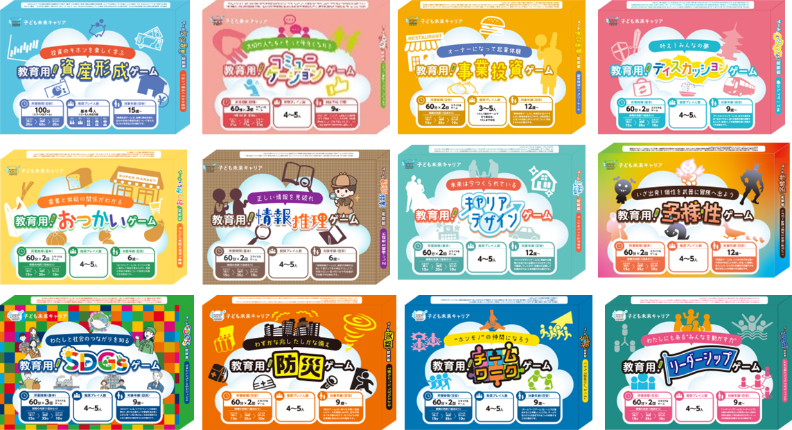 『子ども未来キャリア』は、子どものときから夢や目標を持ち、グローバル社会で必要となる知識と能力を育む、キャリア教育用ボードゲーム教材です。ボードゲームを通じた疑似体験と、スライド教材を活用した学習を組み合わせた「遊び×学び」を融合した内容で、主体的に楽しく学ぶことができます。