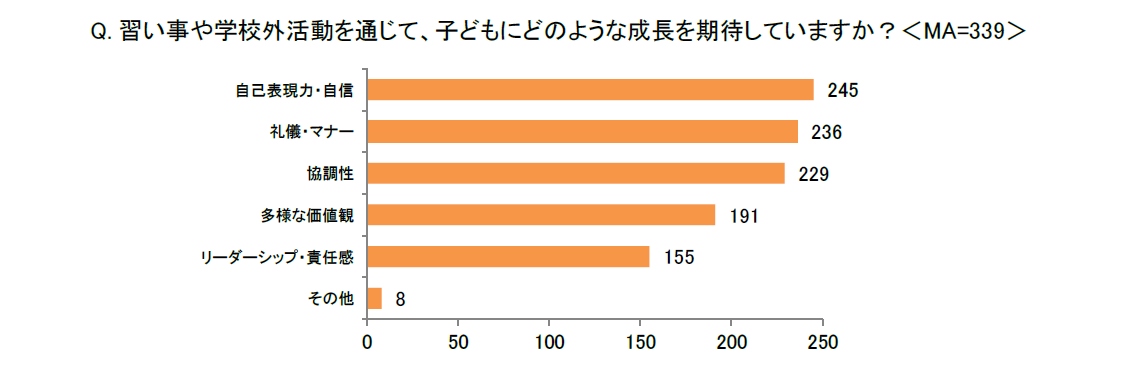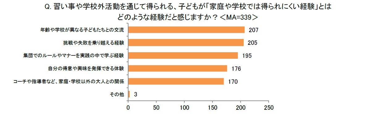 「習い事や学校外活動を通じて、子どもにどのような成長を期待していますか?<MA>」と尋ねたところ、「自己表現力・自信」(245)が最も多く、次いで「礼儀・マナー」(236)となりました。また、「習い事や学校外活動を通じて得られる、子どもが『家庭や学校では得られにくい経験』とはどのような経験だと感じますか?<MA>」という質問では、「年齢や学校が異なる子どもたちとの交流」(207)が最多回答となりました。次いで「挑戦や失敗を乗り越える経験」(205)や「集団でのルールやマナーを実践の中で学ぶ経験」(195)が続くことから、親が期待する「自己表現力・自信」の成長に加え、多様な人間関係や挑戦の機会において、困難に立ち向かう精神的な逞しさや、集団生活で必要となる社会的な規律といった面においても、子どもの確かな成長を感じていることが読み取れます。