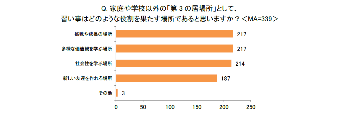 「家庭や学校以外の『第3の居場所』として、習い事などの活動はどのような役割を果たす場所であると思いますか?<MA>」と尋ねたところ、「挑戦や成長の場所」(217)および「多様な価値観を学ぶ場所」(217)が同率で最多の回答でした。次いで「社会性を学ぶ場所」(214)が続きました。この結果から、習い事などは、子どもが自ら挑戦し成長したり、多様な価値観に触れたりできる家庭や学校以外の貴重な「第3の居場所」として、より学びや成長に直結した役割が期待されていることがうかがえる結果となりました。