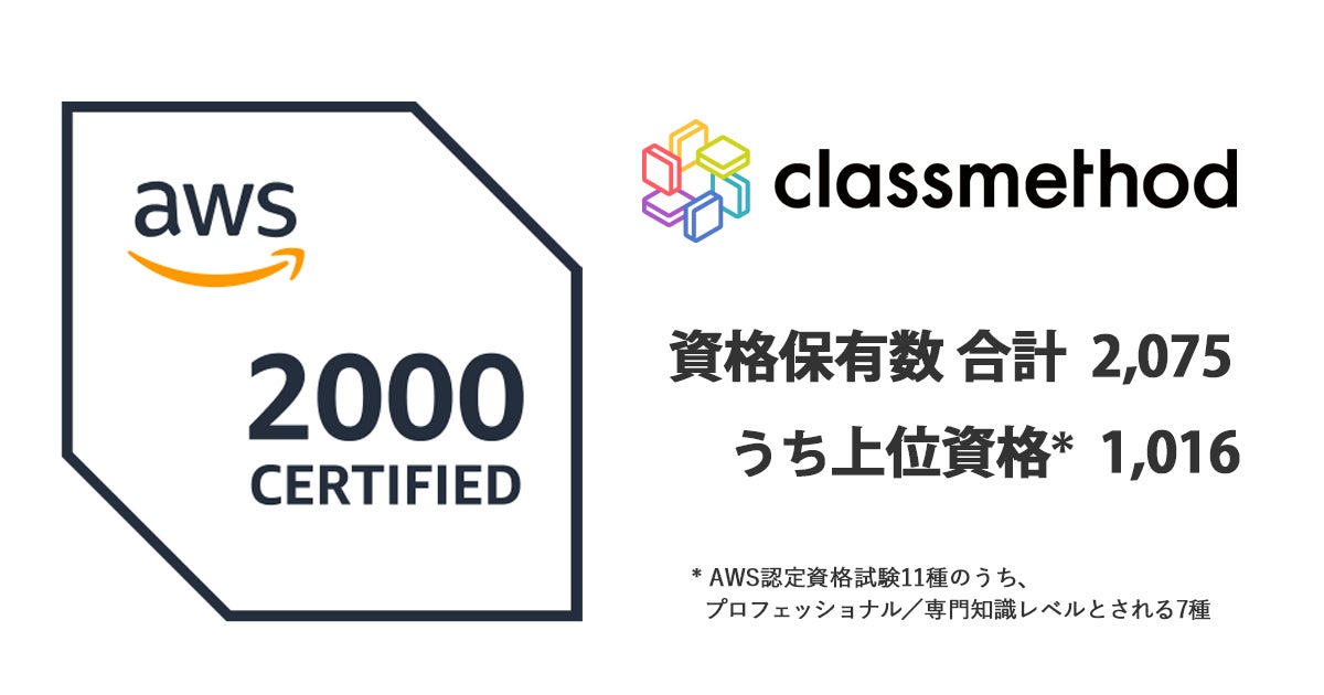 クラスメソッド株式会社(本社:東京都千代田区、代表取締役社長:横田 聡、以下「クラスメソッド」)は、社員が保有するアマゾン ウェブ サービス(AWS)認定資格数が2022年3月31日時点で2,000を超え、AWSから「AWS 2,000 Certified」の認定を受けたことをお知らせします。