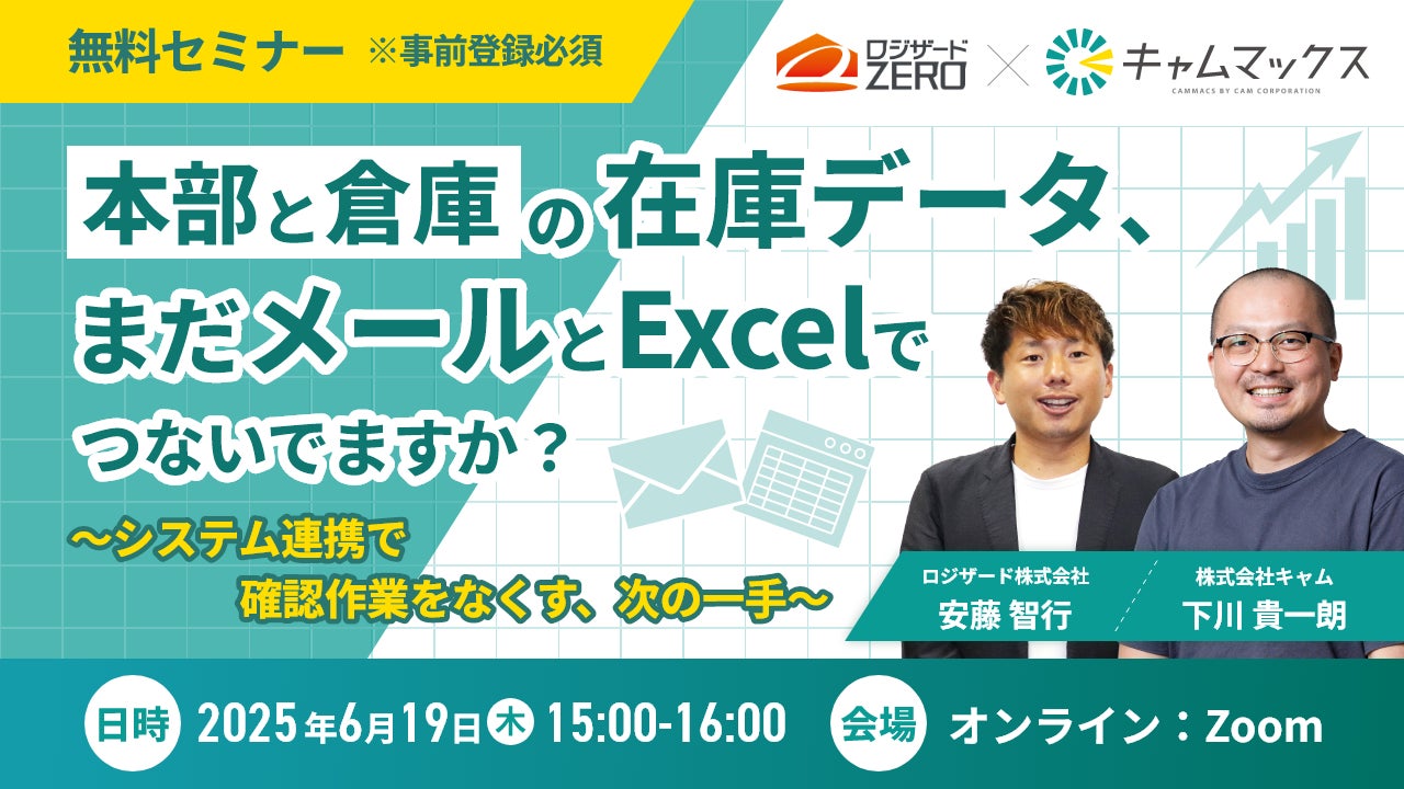 クラウド型在庫管理システムのリーディングカンパニーであるロジザード株式会社(東京都中央区、代表取締役社長:金澤 茂則、以下:ロジザード)は、株式会社キャム(福岡県福岡市中央区、代代表取締役CEO:下川 良彦、以下:キャム)と共催ウェビナー『本部と倉庫の在庫データ、まだメールとExcelでつないでますか?~システム連携で確認作業をなくす、次の一手~』を2025年6月19日(木)15:00〜16:00に開催決定、申し込み受付を開始しました。