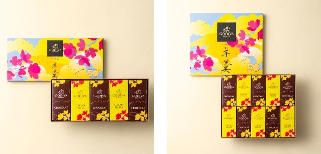 日本上陸50周年の感謝の想いを込めた、GODIVAと伝統の和菓子のコラボレーション。小豆生あんとチョコレートのコク深い味わいの「ショコラ」とカカオフルーツと白あんのさわやかで上品な味わいの「カカオフルーツ」2種類を詰め合わせました。