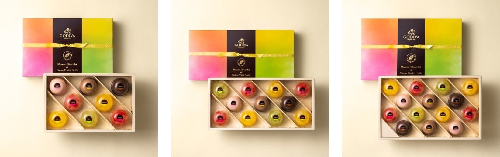 ゴディバからカカオをフルーツとして楽しむことができる、つめたいデザートが登場。カカオの白い果肉部分から絞った果汁を使用した、みずみずしくさわやかな酸味が特徴のジュレに、食感の異なるカットゼリーを1つのカップに合わせたカカオフルーツジュレ3種と、上質なチョコレートを使用した、なめらかな舌ざわりのムースショコラ3種をアソートメントしました。