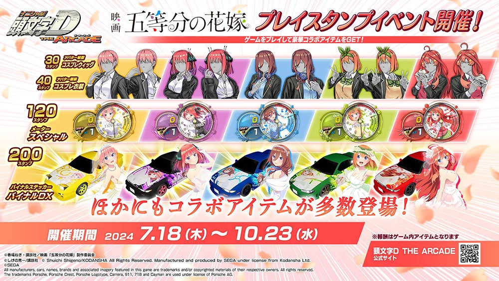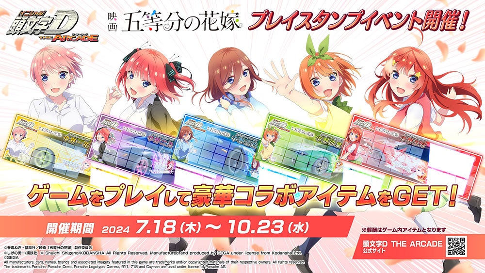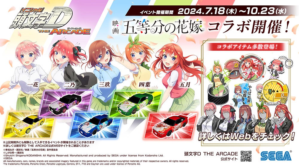 株式会社セガ フェイブ(本社:東京都品川区、社長:杉野行雄、以下セガ フェイブ)は、アミューズメント施設向けタイトル『頭文字D THE ARCADE(以下、頭文字DAC)』におきまして、2024年7月18日(木)より『五等分の花嫁』とのコラボレーションイベントを開催中です。