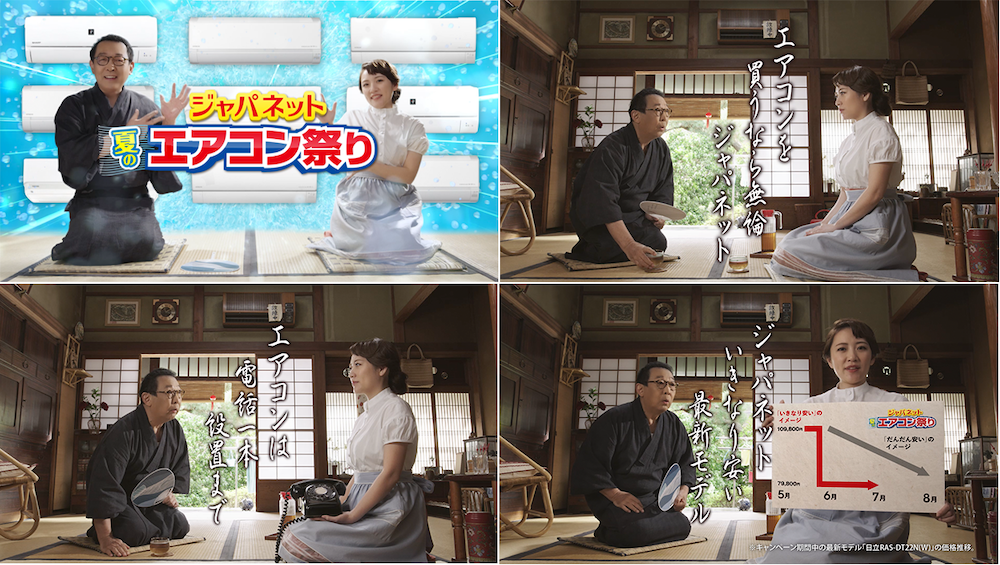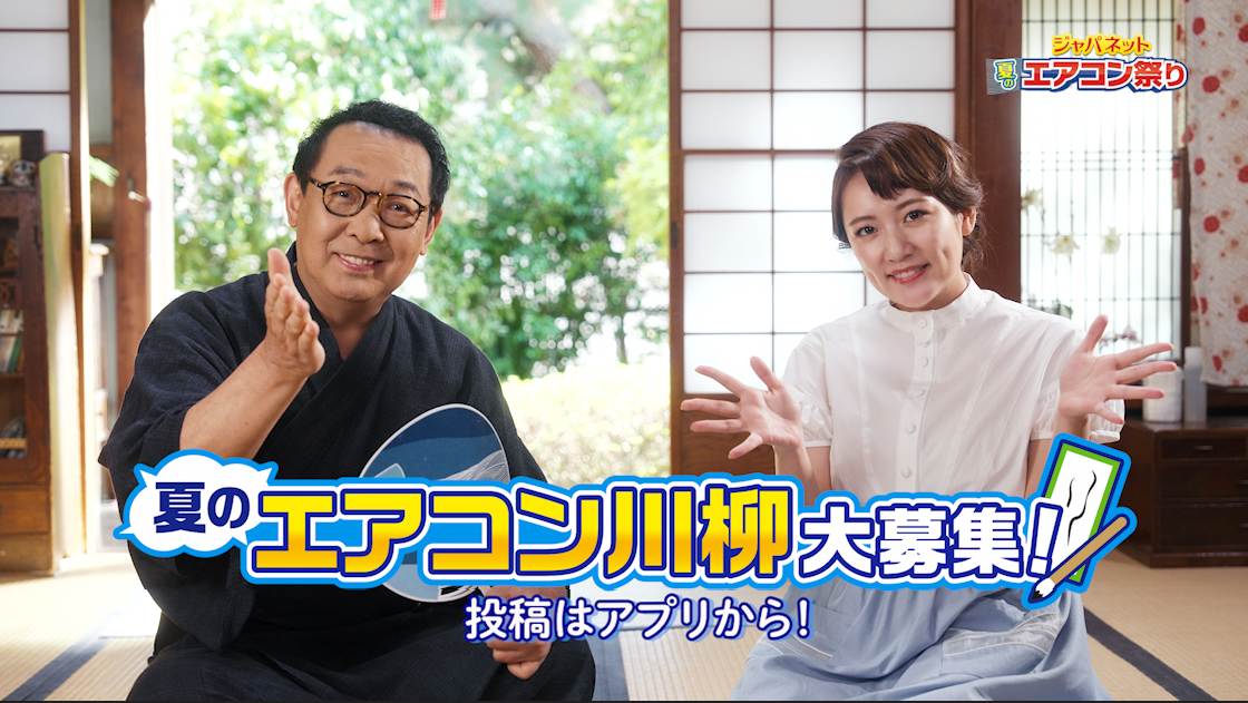 高橋さんはCMごとに1句ずつ川柳を披露し、「エアコンを 買うなら無論 ジャパネット」、「ジャパネット いきなり安い 最新モデル」、「エアコンは 電話一本 設置まで」と本キャンペーンを川柳で表現します。暑い中、会話でも省エネを目指し、最少の文字数で想いを伝えきる高橋さんの川柳が耳に残るCMです。