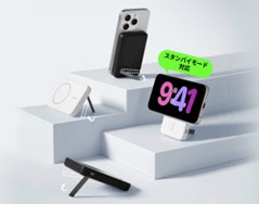 本製品はクレジットカード並みのコンパクトな大きさで、5,000mAhの製品は一円玉の直径より薄い1.4cmとサイズに優れた製品です。Qi2対応で、スマートフォンに貼り付けるだけでワイヤレス充電が可能なほか、パススルーモードでは最大15Wの急速充電が可能です。また、スタンド搭載で縦横を問わず4方向で使うことができます。