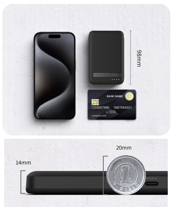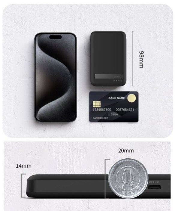 ・カメラに干渉しないコンパクトさ:クレジットカード大のコンパクトなサイズで、装着してもカメラに干渉しません。iPhoneが純正ケースを装着した場合でも、レンズに干渉せず、最適なサイズを実現しました。5,000mAhバッテリーの場合、直径は約1.4cmで一円玉の直径より薄いデザインになっています。
