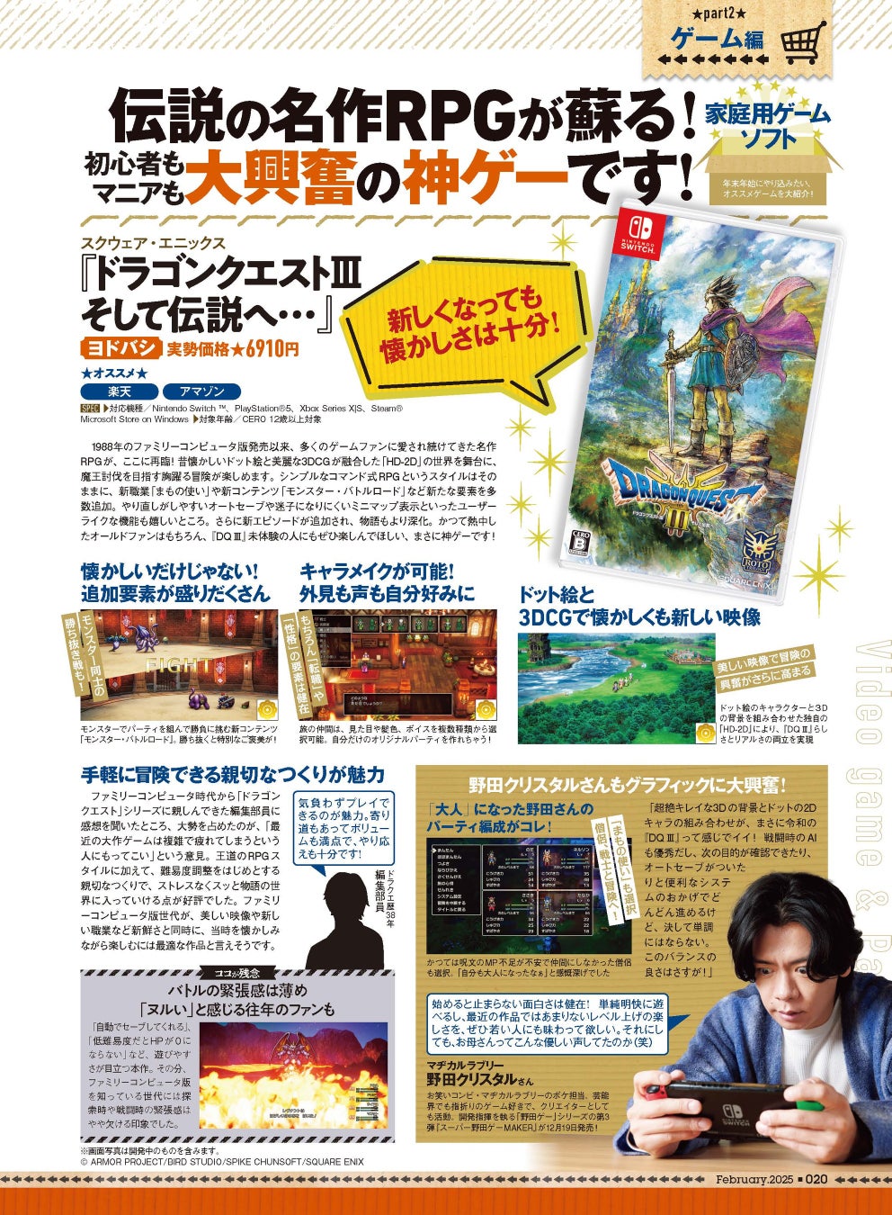 ゲーム編では、マヂカルラブリーの野田クリスタルさんが緊急参戦! 話題の「ドラゴンクエストⅢ そして伝説へ…」と、野田さん激ハマりゲーム3作品について、熱く語っています。大人でも楽しめるゲームを探している人は必見です!