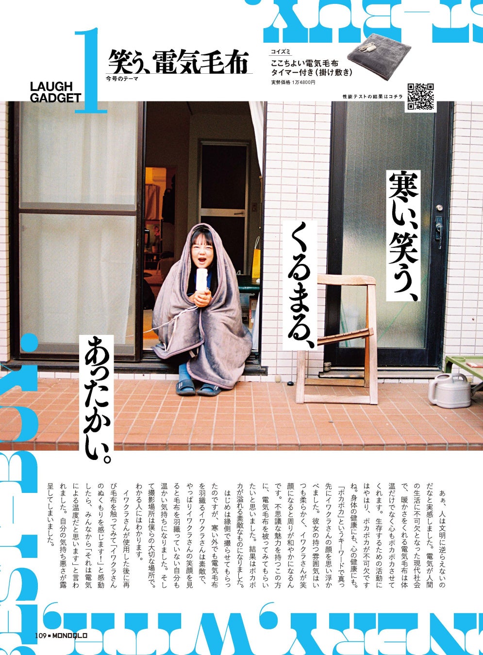 「リアルな部屋で、そこに生まれる風景を」。本誌ベストバイ製品の購入を迷っている方に、その製品が自宅にあるとどう笑顔になれるかを提案する新連載「笑う、家電。」がスタートしました。記念すべき第1回目のテーマは「笑う、電気毛布」です。蛙亭のイワクラさんに、電気毛布を被ってみてもらいました。