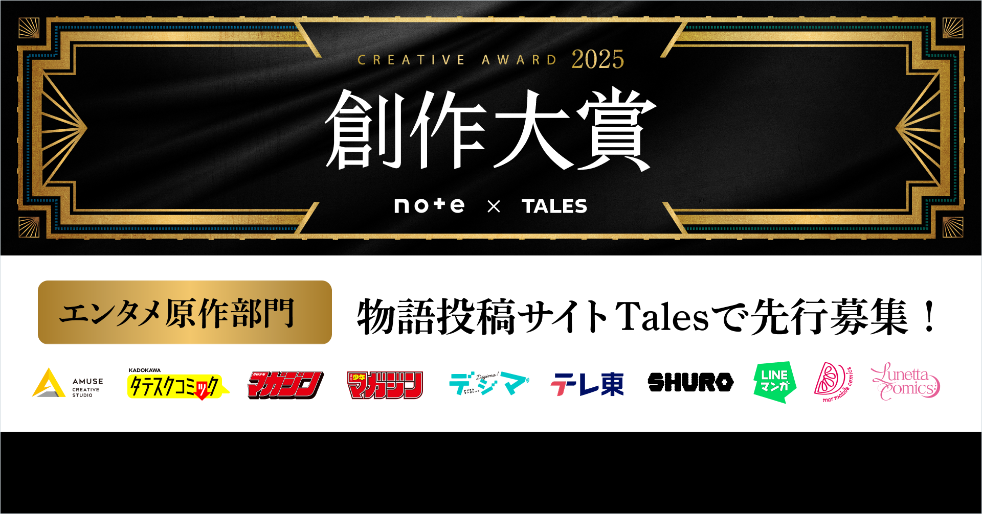 そこで、note主催で今年も開催される創作大賞2025の一部ジャンルについて、Talesでも投稿・応募が可能となりました。先がけとして、本日より「エンタメ原作部門」の先行エントリー受付をTales限定ではじめます。「エンタメ原作部門」は、マンガや映像の原作となり得る作品を求める部門で、アミューズクリエイティブスタジオ、KADOKAWAタテスクコミック、月刊少年マガジン編集部、週刊少年マガジン編集部、デジタルマーガレット編集部、テレビ東京、マガジンハウス漫画編集部、LINEマンガ、マーマレードコミックス、ルネッタコミックスの全10メディアが審査に参加します。