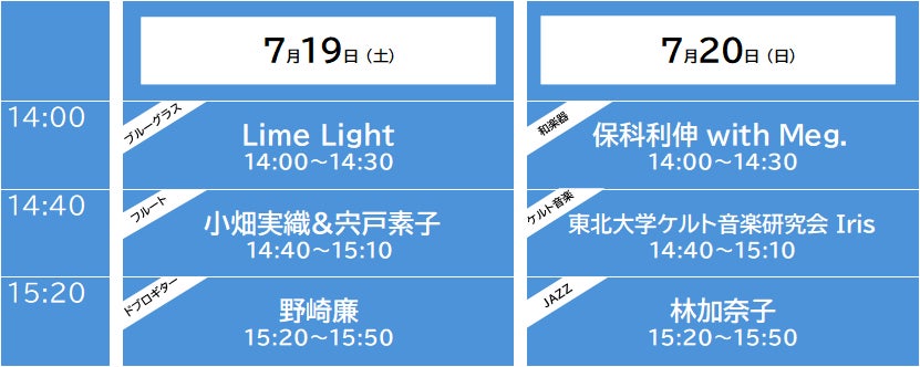 各日に3組のアーティストによるミュージックステージを開催します。ブルーグラス、フルート、ドブロギターなど、多様なジャンルの音楽が夏まつりを盛り上げます。