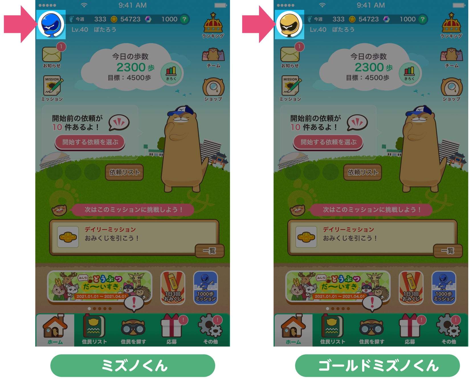 これまでにもミズノの公式キャラクター「ミズノくん」は通常キャラクターとして登場してきましたが、今回、「ミズノくん」やレア住民の「ゴールドミズノくん」もアイコンに設定することができるようになります。住民のおたすけポイントを50にして、アイコンをミズノくんに変更しよう!