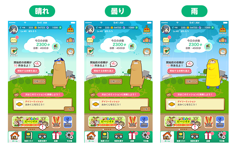 「LD40Ⅵ」がどんな天気でも快適に歩けることから、期間中は、ユーザーがいる場所の天気に合わせてホーム画面が変化します。晴れ、曇り、⾬の3パターンに変わり、ホーム画面にいる公式キャラクター「ぽたろう」も天気に合わせて変化します。雨の日にはレインコートを着るなど、天気に関わらずウォーキングを楽しめる機能を搭載しました。