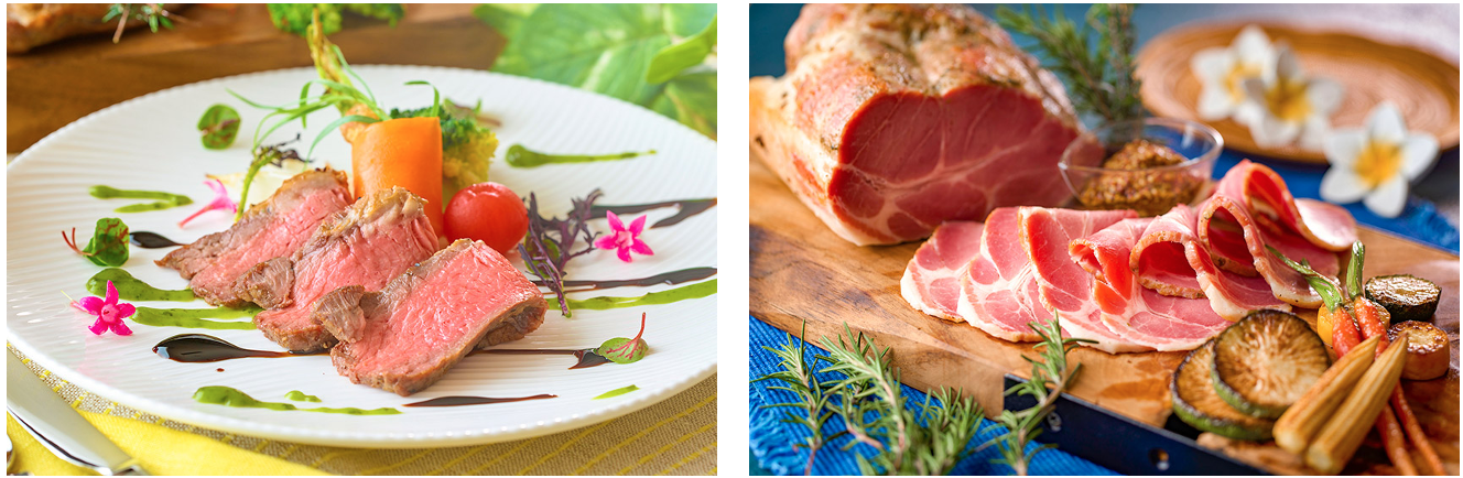 右:夢の競演!「ローストビーフとローストポークの盛り合わせ」は特製ソースを添えて食べ比べるのもお薦めです。