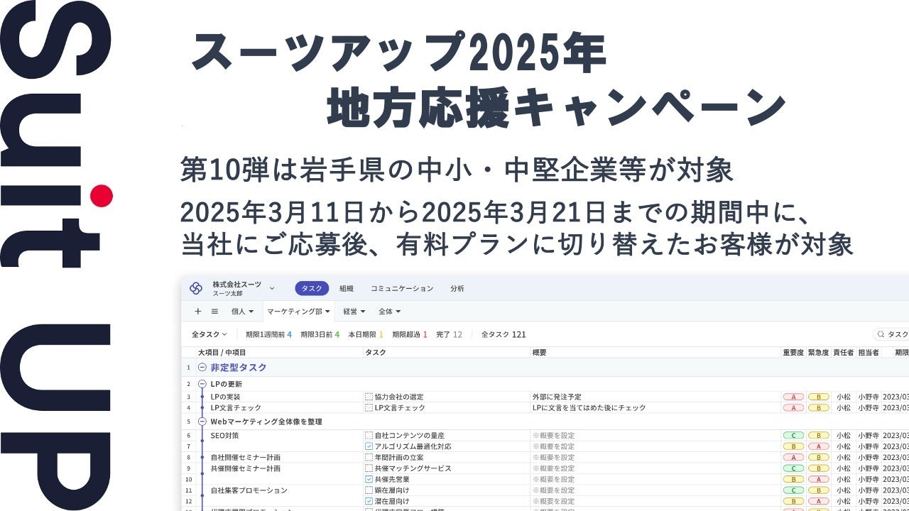 株式会社スーツ(所在地:東京都千代田区、代表取締役社長CEO:小松 裕介)は、「スーツアップ2025年地方応援キャンペーン」第10弾として、岩手県の社員数100名未満の中小・中堅企業、スタートアップを対象に割引キャンペーンを実施いたします。