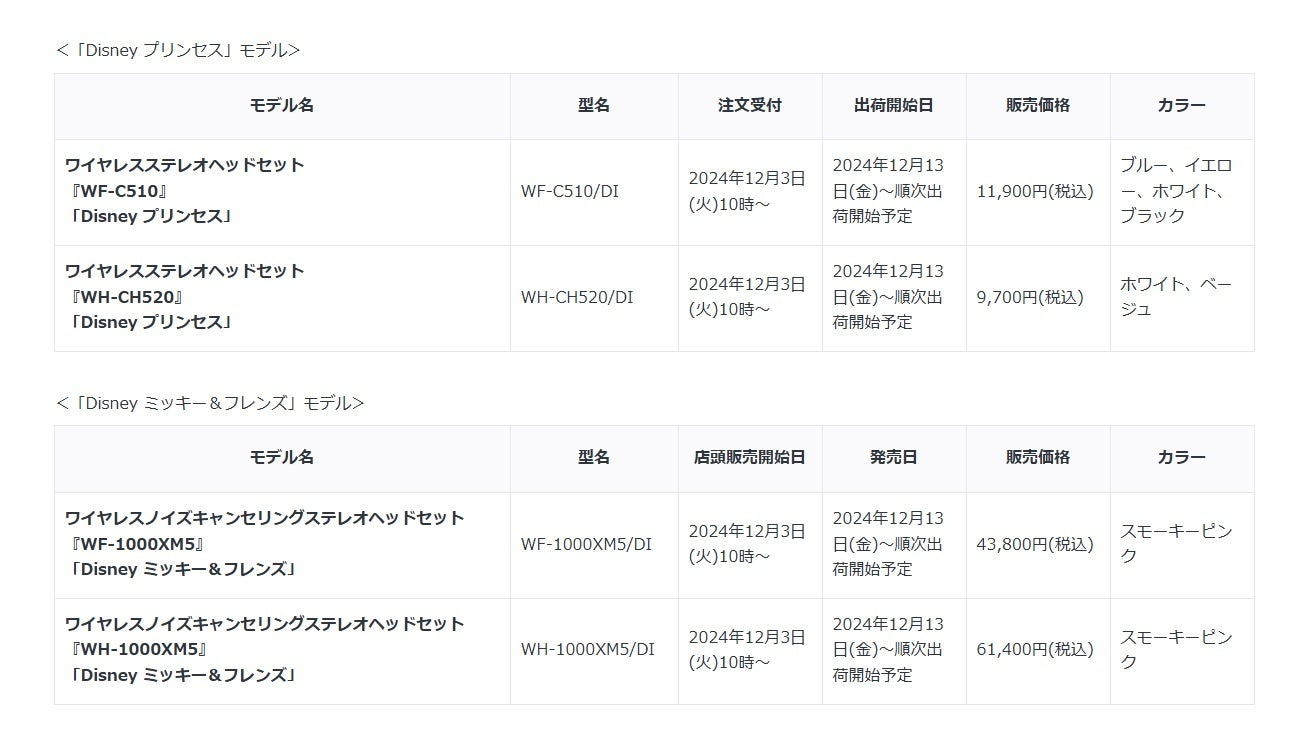 ソニーマーケティング株式会社は、「ディズニープリンセス」のデザインを刻印したソニーストア限定デザインのワイヤレスステレオヘッドセット『WF-C510』『WH-CH520』と、「Disney ミッキー&フレンズ」のキャラクターを刻印したワイヤレスノイズキャンセリングステレオヘッドセット『WF-1000XM5』『WH-1000XM5』の新色スモーキーピンクの注文受付を本日12月3日(火)から開始します。