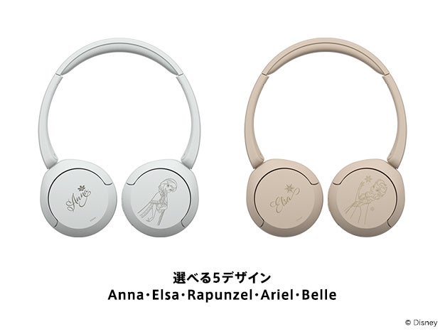 本体のヘッドホン部分には5種類のデザイン(「アナ」「エルサ」「ラプンツェル」「アリエル」「ベル」)から1デザインを刻印します。本体カラー2色(ホワイト/ベージュ)の10パターンの組み合わせから選べます。