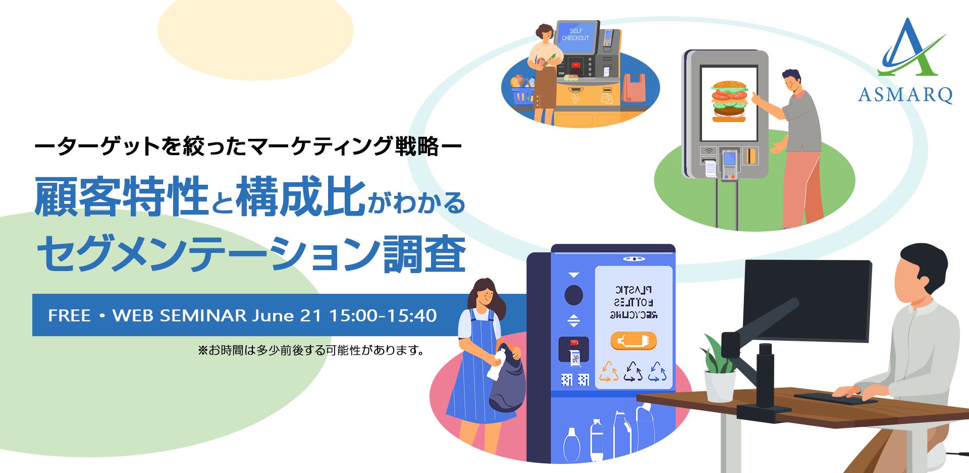 株式会社アスマーク(東京都渋谷区東、代表取締役:町田正一)は、自社商品やサービスの"顧客特性"や"潜在ニーズ"を細分化することで、消費者特性の深層理解に役立てられる「セグメンテーション調査」に関するセミナーを6月21日(火)15:00に開催いたしますのでお知らせいたします。