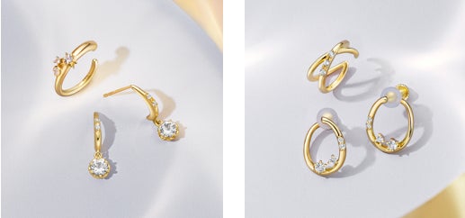 イエローゴールドカラーの地金に星のようなトパーズがきらめく、イヤーカフとピヤス、イヤーカフとイヤリングのセットも。冬の空に煌々と輝く星と三日月を思わせる地金のラインが魅力のセットジュエリーが、耳元を明るく照らします。