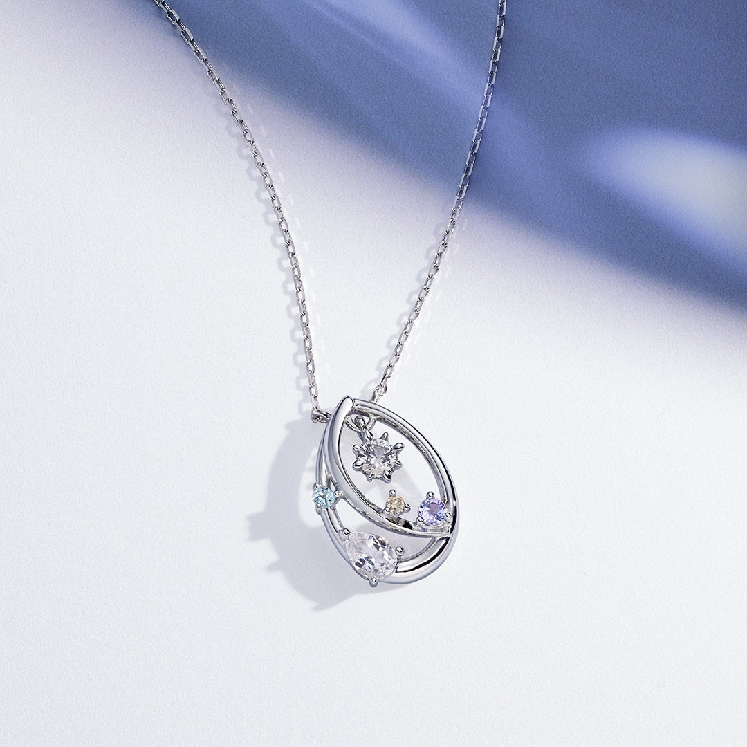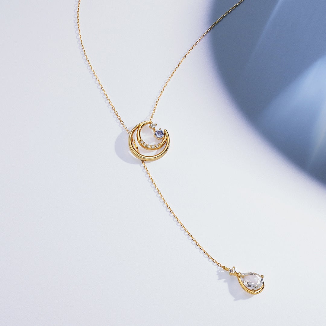 冬の夜空に広がるきらめきを様々な天然石のセッティングで表現したジュエリー。揺らめく大粒のストーンが一番星を連想させるネックレスは、空に浮かぶ月と星に祝福されているかのような華やかなデザインです。月のモチーフから流れるようにしずく型のトパースが揺れる、ラリエット風のネックレスは、主役級の存在感を放つアイテム。海に浮かぶ月をモチーフにしたリングは、リズミカルに並んだ月や天然石の透き通ったブルーの輝きが手元を華やかに彩ります。