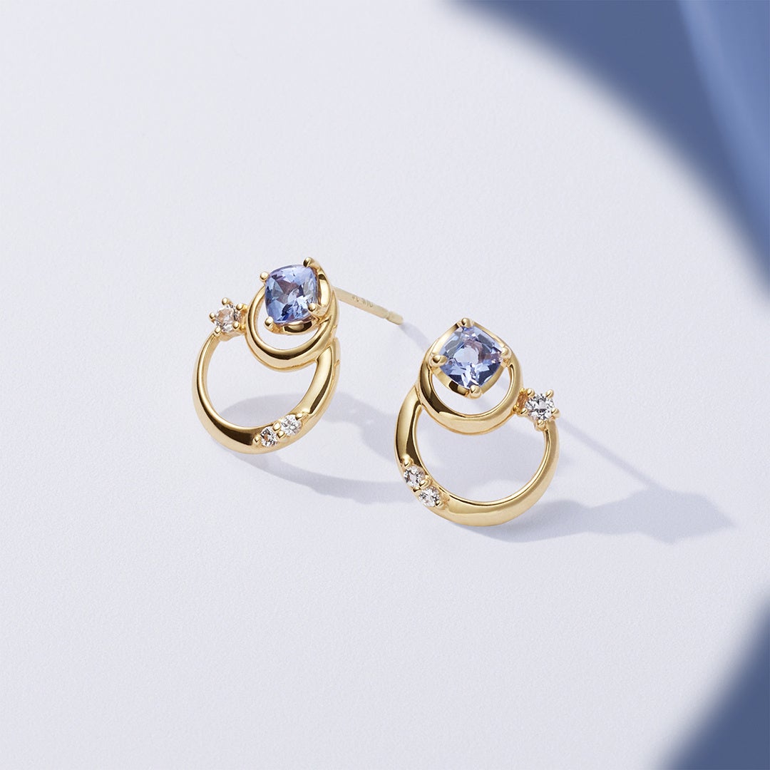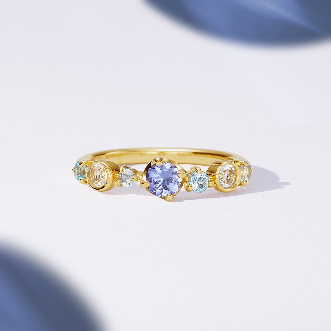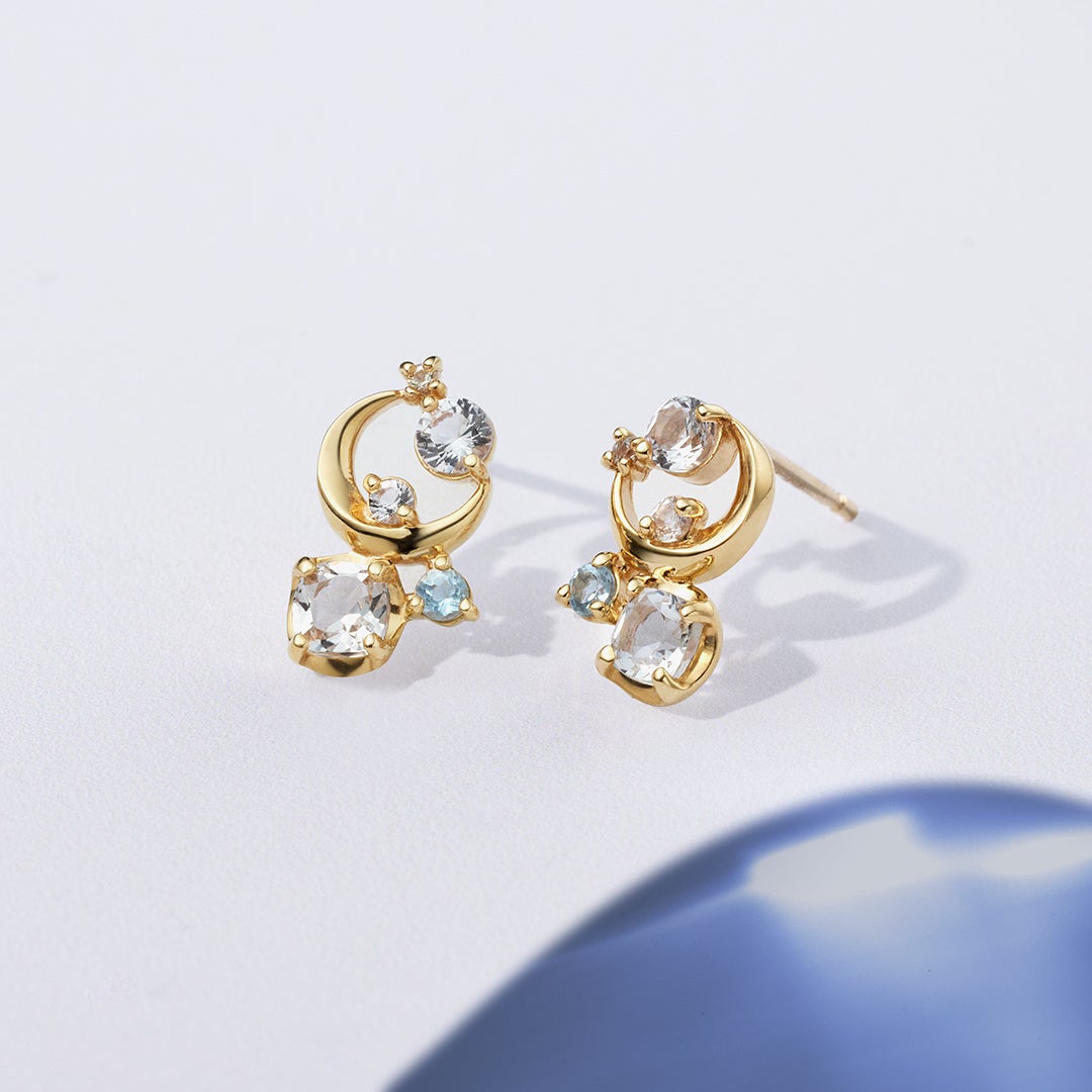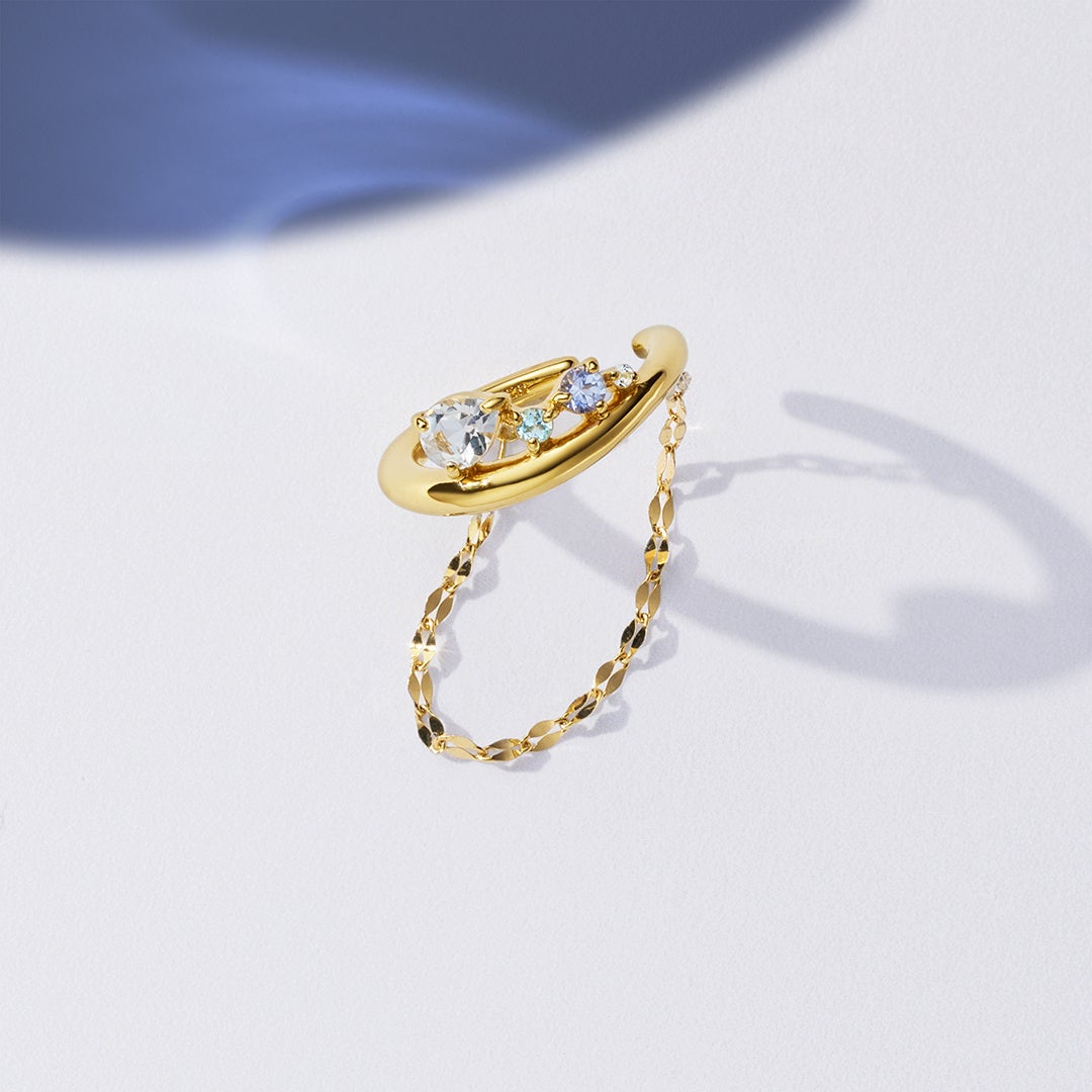 夜空と水面に映り込むダブルムーンや、煌めく星々からインスピレーションを受けたシリーズ。幻想的な情景を、イエローゴールドの地金のラインに留められたブルーの天然石で表現しました。クリスマスへの祝福をきらめきの中に閉じ込めるように、タンザナイトやダイヤモンド、トパーズがイエローゴールドのコントラストで輝く、目を惹くデザインです。