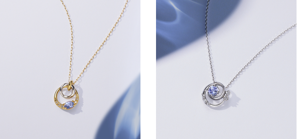 プラチナとゴールドのサークルを繋ぐことで夜空に輝く月の光と、水面に映って揺れる月影を表現したリュクスなネックレスも登場。装いを選ばないミニマムなデザインながら、タンザナイトとダイヤモンドが上品に揺れる贅沢なジュエリーです。