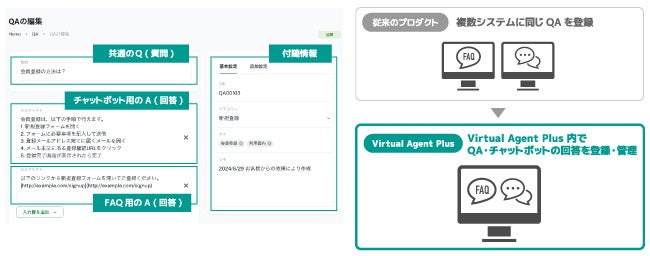 従来型のFAQシステムの場合、複数のデジタルチャネルに登録されているQ&Aが同一でも、チャネルごとにシナリオ設計や登録、変更が発生するため、品質のばらつきや運用工数が生じていました。Virtual Agent PlusのUIは視認性・操作性に優れ、ひとつのQ(質問)に対して、FAQとチャットボット用に2つ以上のA(回答)をQ&Aとして登録できます。これにより、シナリオを含む構築・運用・メンテナンスの業務効率化とチャネル品質の平準化、ナレッジの一元管理を実現します。また、付随情報の同時管理機能の活用によって、ナレッジ・FAQデータを一括管理することができます。