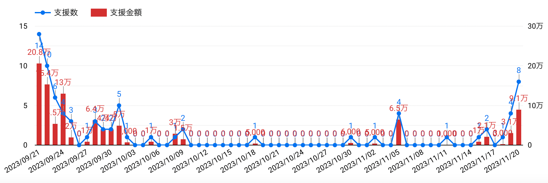 ▼支援募集期間を通じた支援数(折れ線)、及び支援金額(棒線)