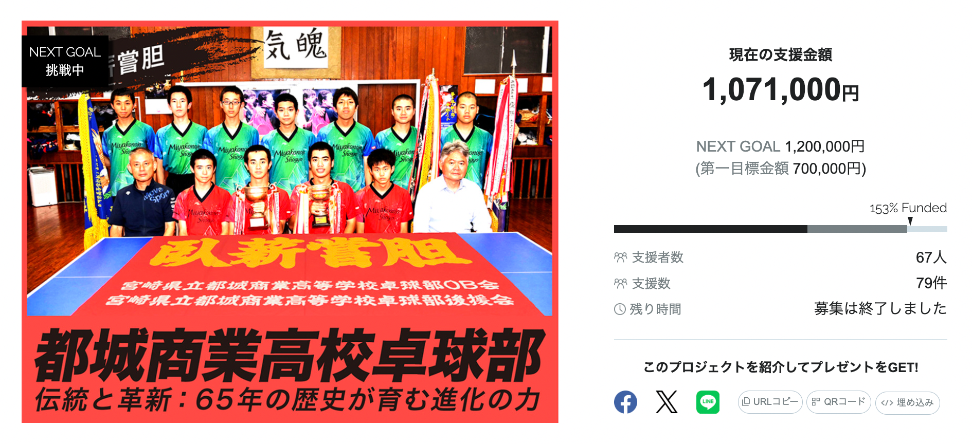 1.都城商業高校卓球部「伝統ある都城商業高校卓球部に頑張れる環境を!! 卓球場にエアコンを!!#臥薪嘗胆」プロジェクト、目標金額70万円達成!
