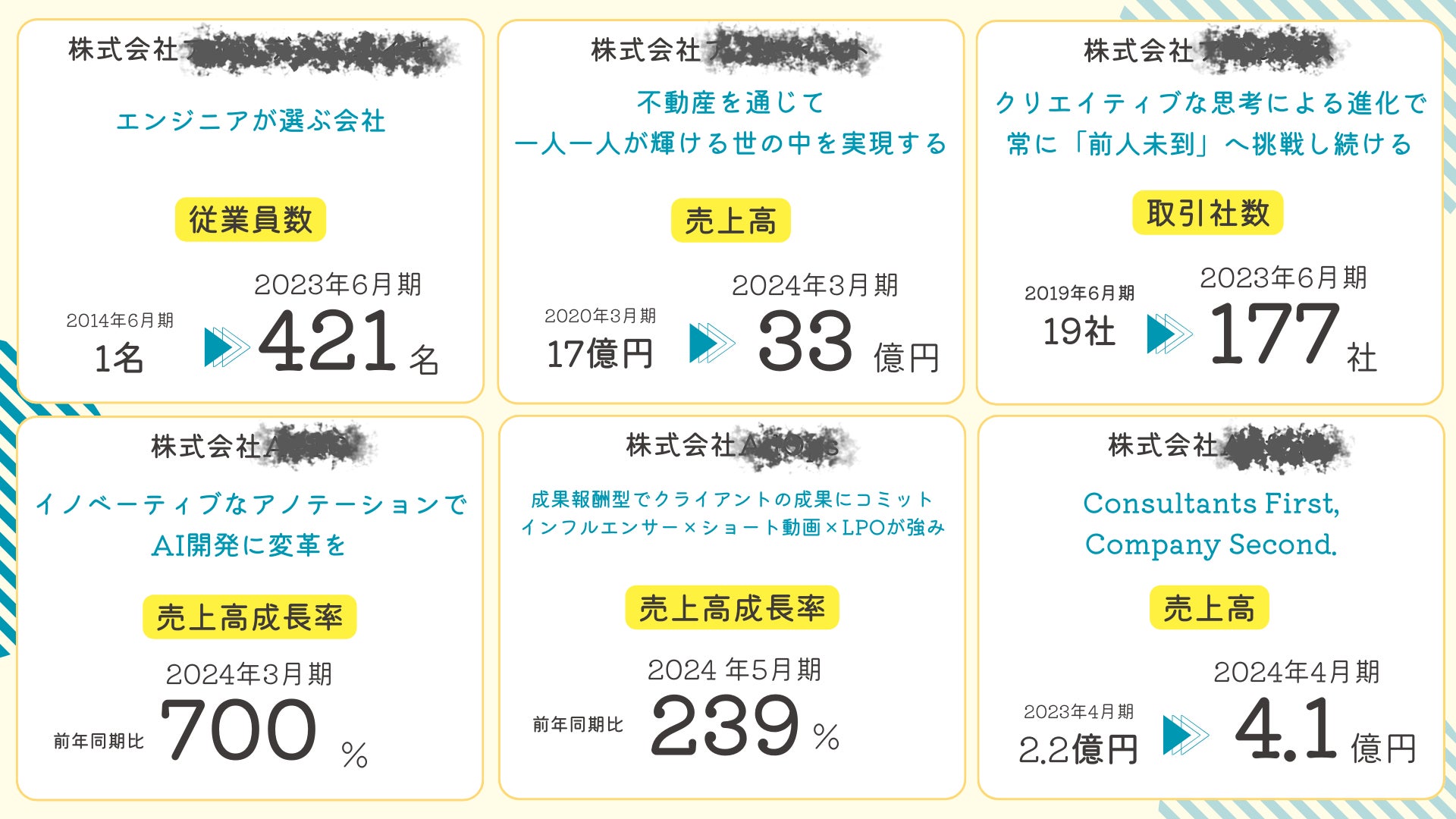 成長企業のビジョンに合わせて、売上や従業員数など各社の成長率がわかるデータをまとめています。