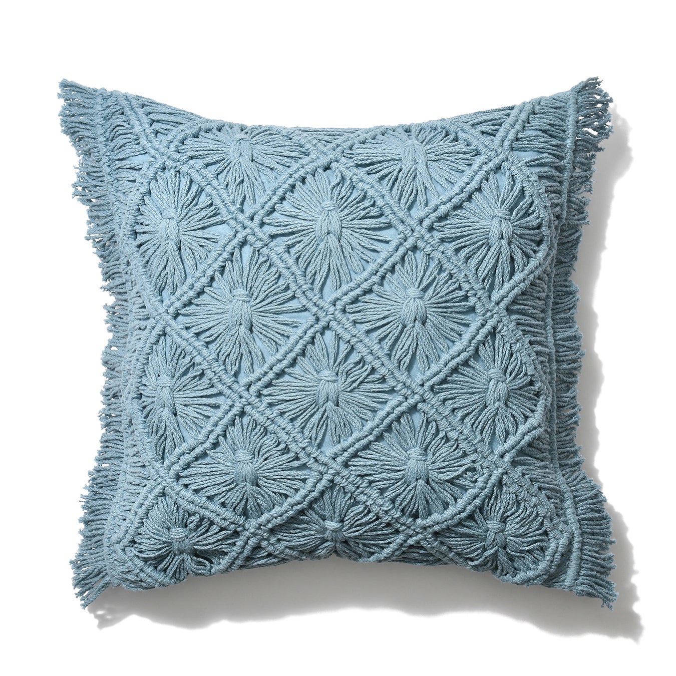 人気のマクラメ編みデザインのクッションカバーです。編み方にこだわったデザインと両端のフリンジがポイントです。春夏シーズンに取り入れたいお部屋のアクセントになるアイテムです。