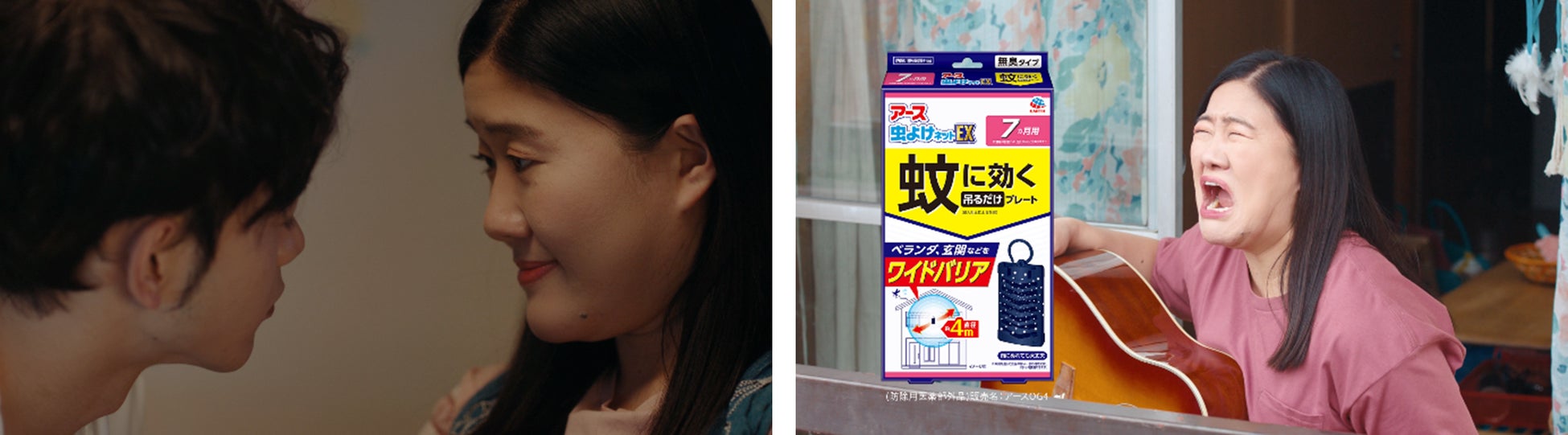 そこにとんだ邪魔者が。しゅんたの顔に蚊がとまり、気づいた「よしこ」さんは鬼の形相を見せ、蚊を狙って思い切りビンタ。我に返った「よしこ」さんは「あ、ちがうの。蚊が・・・」と説明するものの、時すでに遅し。「よしこ」さんの恋は、蚊のせいで儚くも終わりを告げてしまいました。翌日、失恋を吹っ切るかのように、「吊っときゃよかった~♪蚊に効く 吊るだけプレート~♪」と、ギターを片手に熱唱する「よしこ」さん。その視線の先には、「よしこ」さんの失恋を悲しむかのように『アース虫よけネットEX 蚊に効く 吊るだけプレート』がゆらめいています。感極まった「よしこ」さんは思わず「クソがぁ!!!」と絶叫。犬の散歩で通りがかった「まひる」さんは、熱唱する「よしこ」さんを見守りながら、「広い・・・」とつぶやき、『アース虫よけネットEX 蚊に効く 吊るだけプレート』の効果に感心する姿を見せます。