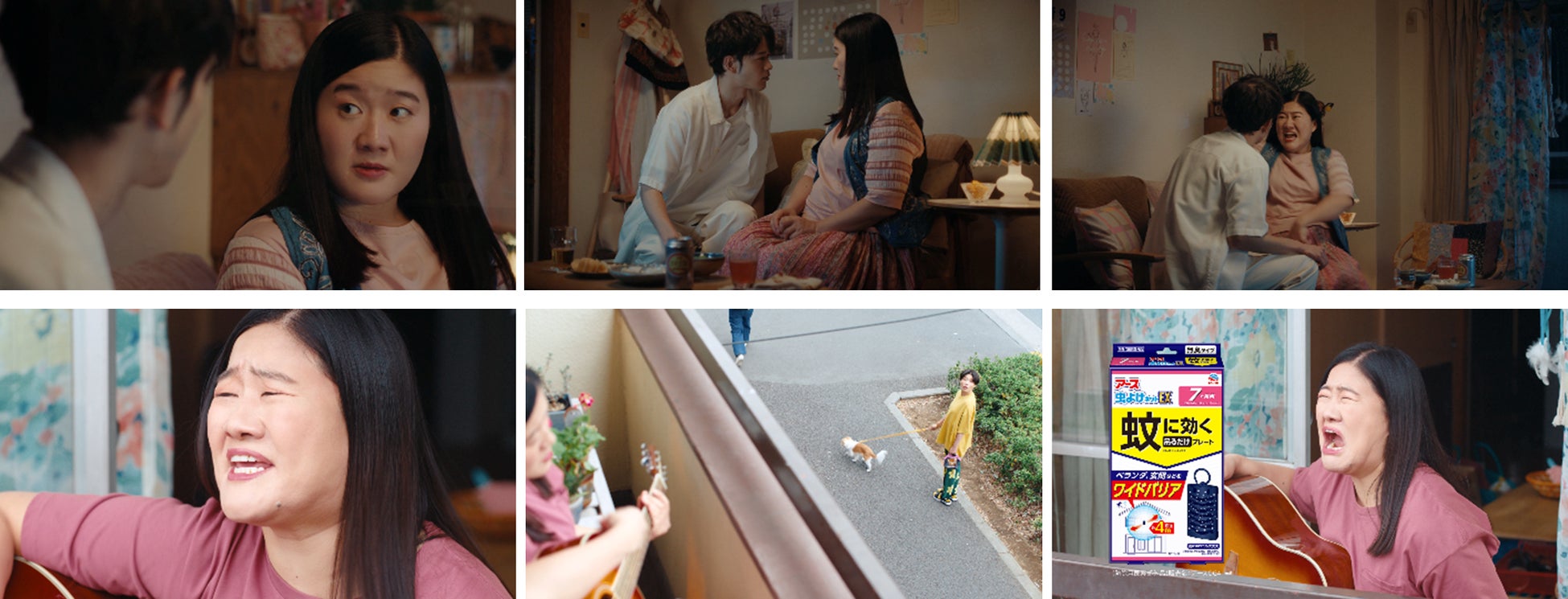 インタビュー映像では、「よしこ」さんが唯一付き合ったアメリカ人との失恋話や、「まひる」さんが中学生のころに担任の先生に抱いた恋心など、甘酸っぱい思い出について語っています。「よしこ」さんが見せるロマンティックな姿や鬼の形相、失恋を吹っ切るかのような熱唱、感情の爆発といったさまざまな一面を通して、『アース虫よけネットEX 蚊に効く 吊るだけプレート』の効果をストレートに表現しています。Web動画を、ぜひお楽しみください。