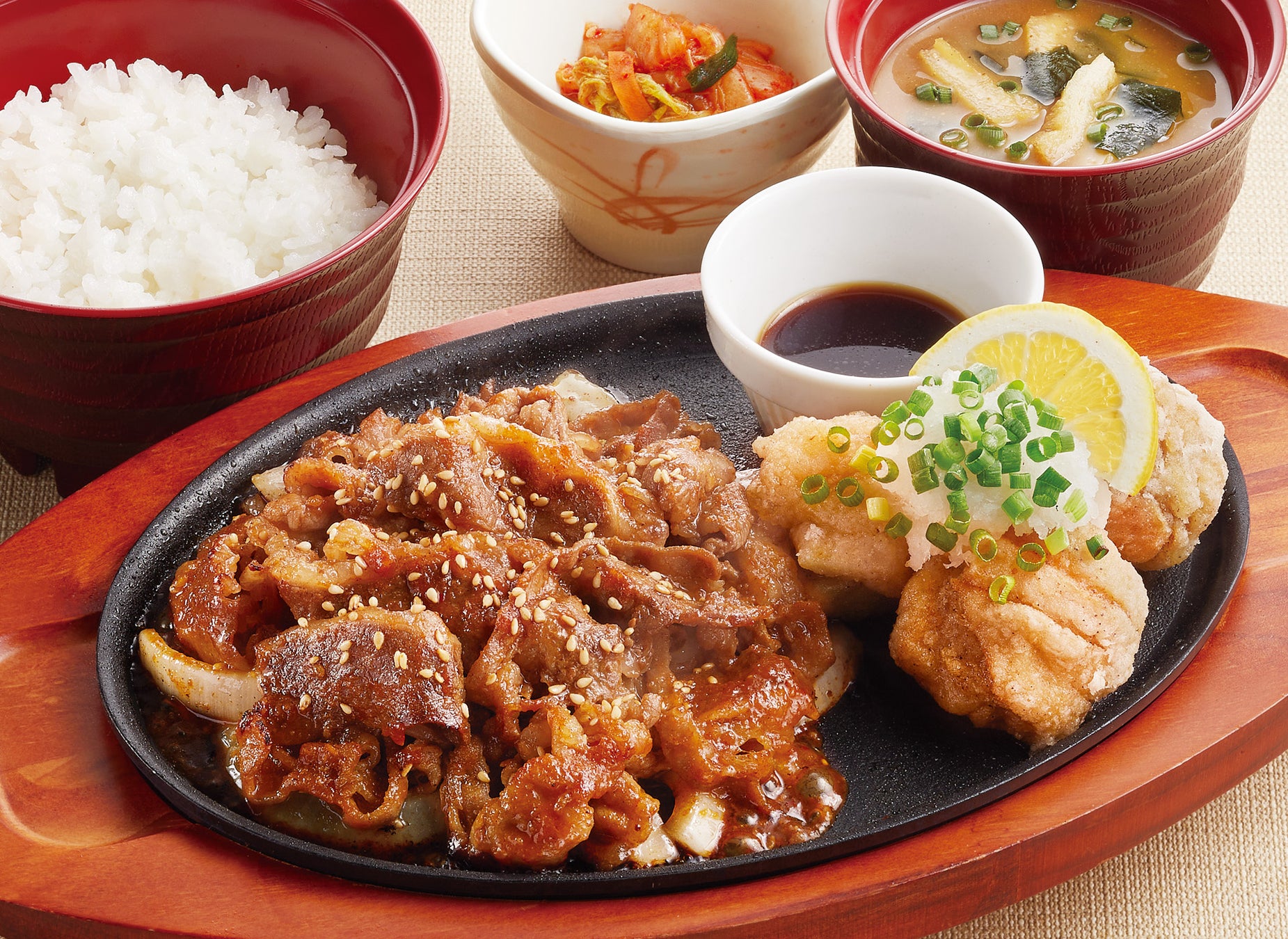特製ダレで仕上げた焼肉と人気の塩唐揚げをあっさり大根おろしで楽しめる、ご飯がとまらない満腹定食です。「お肉」をガッツリ食べたい方へおススメです。