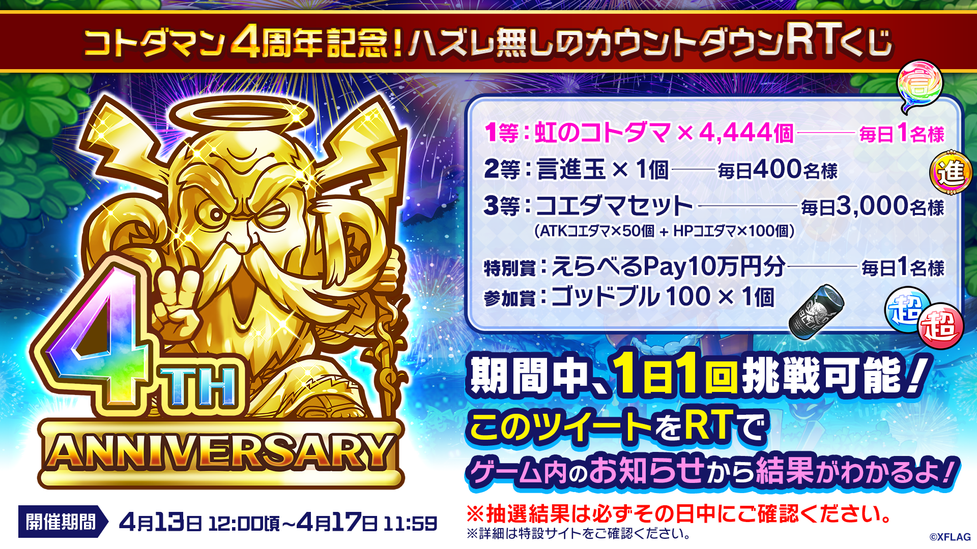 - 「コトダマン4周年記念!ハズレなしのカウントダウンRTくじ」を実施