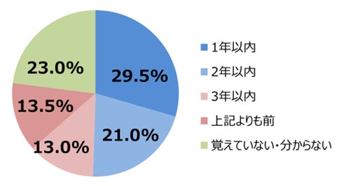 同じく経営者および人事担当者200人に直近の人事評価制度の見直し時期を聞きました。その結果、「1年以内」29.5%、「2年以内」21.0%となり、働き方改革やリモートワークの普及で労働環境が大きく変わる中、この2年の間に約半数の会社で人事評価制度の見直しが行われたことが明らかになりました。